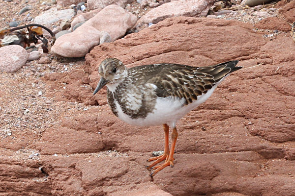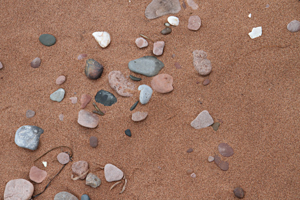Es ist Flut und der Sand ist nass, aber wunderschön rot. So gehen wir am Strand entlang und erst hier füllen wir unsere Flaschen mit Sand...