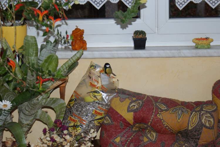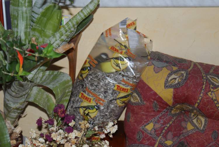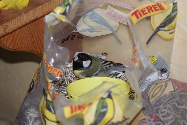 Also da steht ein Sack mit Vogelfutter - schaut ihn genau an!
