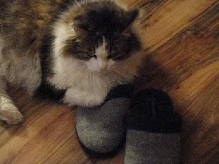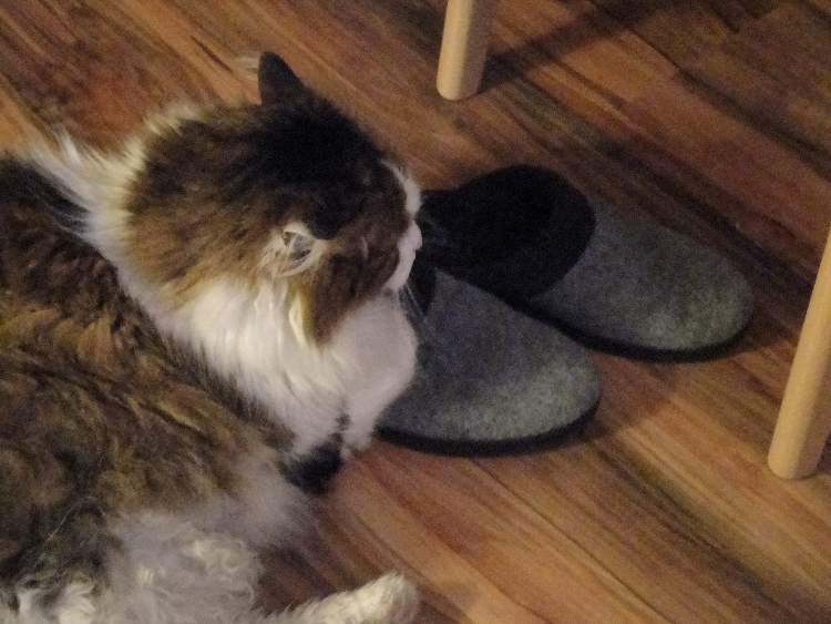 Unser Kater Shaky nimmt, sobald irgendwo Hausschuhe rumstehen, diese sofort in Beschlag.