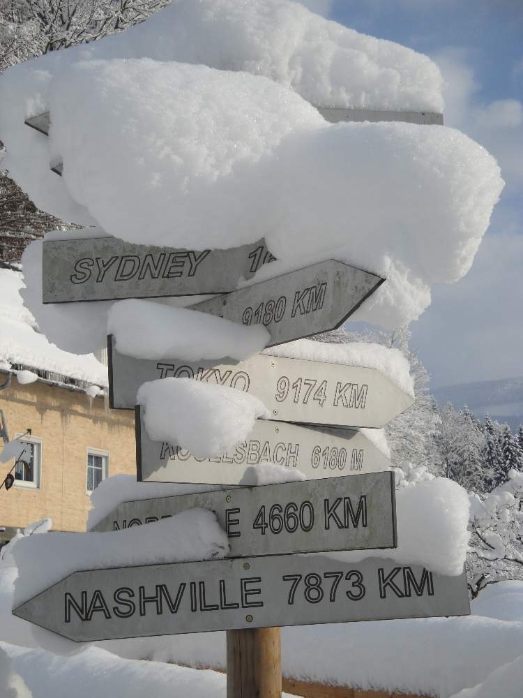 Ein Nachbar hat einen Wegweiser stehen, da will er wohl überall mal hin. Sydney hat er schon soviel ich weis.
