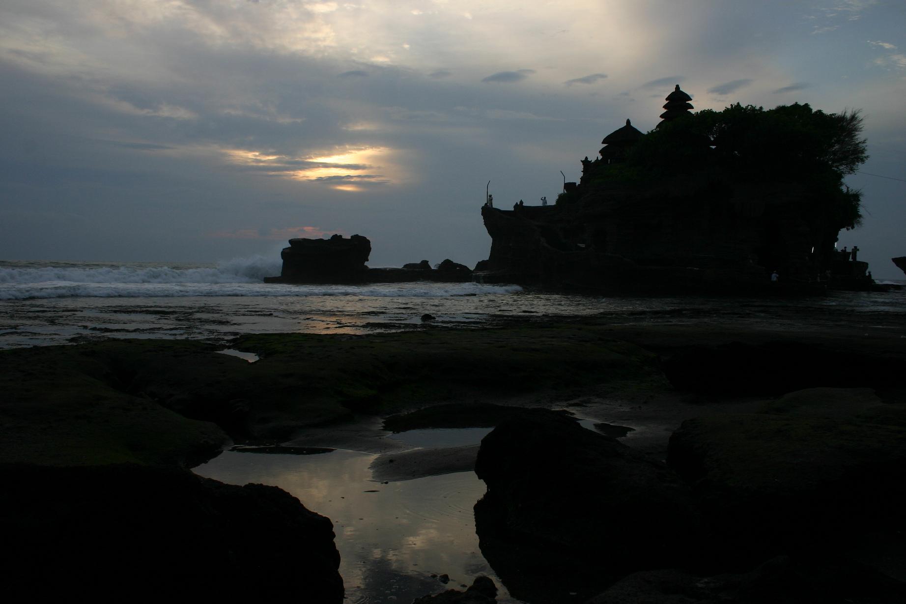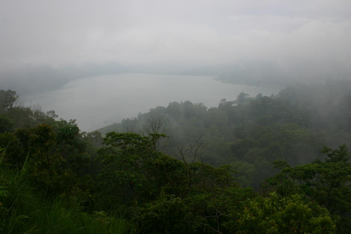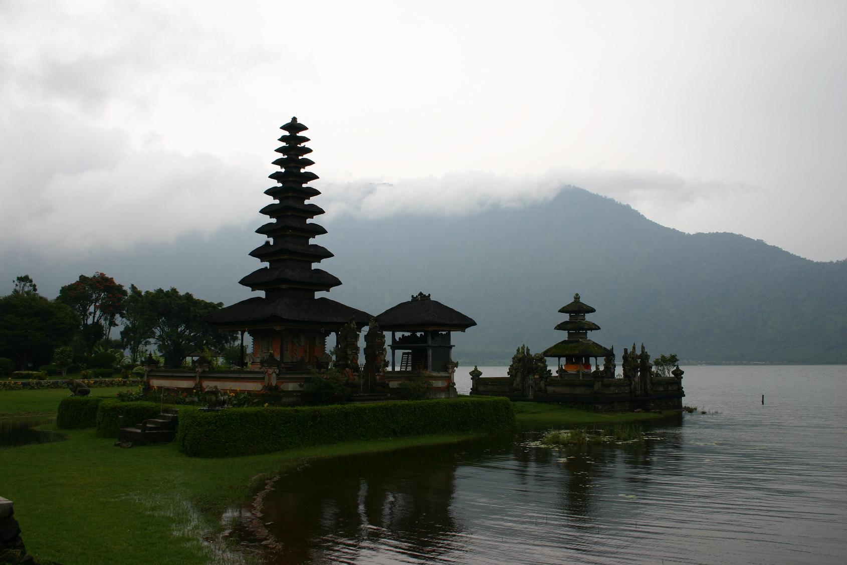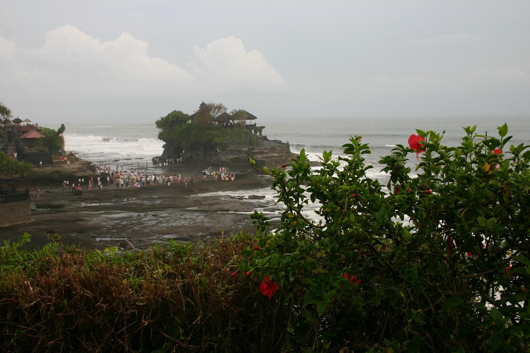 Die letzte Tour führte uns zunächst Richtung Westen bis in das Gebiet von Ubud. Dort gibt es viele Handwerksbetriebe, wie Schnitzereien. Einen haben wir besichtigt und eine sehr schöne Maske erworben. Auch gibt es eine Reihe von Museen, deren Besuch wir ausgelassen haben. In Ubud gibt es einen Handwerkermarkt, den wir besucht haben. Von Ubud ging es dann Richtung Norden durch herrliche Reisterrassen. Leider wurde das Wetter immer schlechter und es begann zu regnen. So blieb es auch als wir bei den beiden Seen, Tamblingan-See und Buyansee ankamen. Unser Fahrer hatte wieder eine Straße gewählt, die uns einen Blick von hoch oben auf die Seen gewähren sollte, aber wir sahen nur eine weiße Wand. Yan meinte immer wieder „ I am so unlucky, I am so unlucky“ als sei er für das Wetter verantwortlich. Wir nahmen es mit Humor und fühlten uns ein bisschen in eine geheimnisvolle Welt versetzt. Yan schlug vor, wir sollten vielleicht im kleinen Restaurant an dieser Aussichtsstelle etwas trinken, vielleicht würde es noch einmal aufreißen. Wir glaubten nicht daran angesichts dieser weißen Wand vor uns. Aber das Wunder trat ein. Nach einer halben Stunden erschienen plötzliche 2 Seen (Foto 1 und 2). Es war ein bisschen wie im Zauberland. Anschließend fuhren wir an den Bratan See. Dort liegt der Pura-Ulun-Danu-Bratan-Tempel – laut Reiseführer auf einer kleinen Insel. Als wir da waren, konnten wir allerdings keine Insel sehen. Vielleicht war der Wasserstand so niedrig. Der Tempel ist aus dem 17. Jhd. Und der Göttin des Sees geweiht. ( Foto 3). Die Tour war sehr lang. Zwar waren wir um 9.00 Uhr bereits gestartet, aber der Weg hat viel Zeit verschlungen und auch unsere Zwischenstopps. Wir wollten zum Abschluss rüber auf die Westseite und noch den berühmten Tempel Tanah Lot sehen. Doch der Abend drohte und der kommt auf Bali sehr schnell. Kurz vor dem Ziel gab es dann auch noch einen Stau. Es war die Vollmondnacht und da ist in den Tempelanlagen überall reichlich los. Offensichtlich war die Straße an einer Stelle gesperrt. Unser Fahrer folgte auf gut Glück einer reihe von Fahrzeugen, die in eine kleine Straße abbogen, und tatsächlich rettete das uns und ermöglichte sogar einen herrlichen Blick auf den Tempel in der Abenddämmerung (siehe das Foto bei Reisefotos). Hier noch zum Abschluss ein Bild vor dem Sonnenuntergang als Foto 4. Die Rückfahrt nach Candidasa dauerte über 2 Stunden und erfolgte im Dunkeln. Erst um 20.30 Uhr kamen wir wieder am Hotel an. Diese Riesentour hat uns 500.000 Rupiah gekostet, also ca. 43 Euro. Nach den ersten drei Tagen Abendessen im Hotel hatten wir entdeckt, dass nur 1, sowie 3 Grundstücke weiter sehr günstige Restaurants vorhanden waren. Seither aßen wir abends in einem schönen Restaurant am Meer erheblich preisgünstiger als im Hotel selber. Doch in dieser Vollmondnacht war es zu und so wählten wir das kleine Restaurant direkt neben dem Hotel. Als die Rechnung, dachte ich, das kann ja nicht wahr sein. Für drei warme Essen, ein großes Bier, 2 Sodawasser und Obst zum Nachtisch inklusive haben wir nu 47.000 Rupiah= 4 Euro bezahlt. Das Leben auf Bali ist wirklich sehr preiswert.