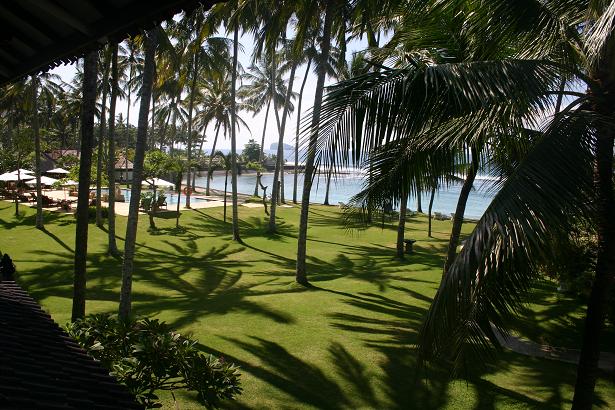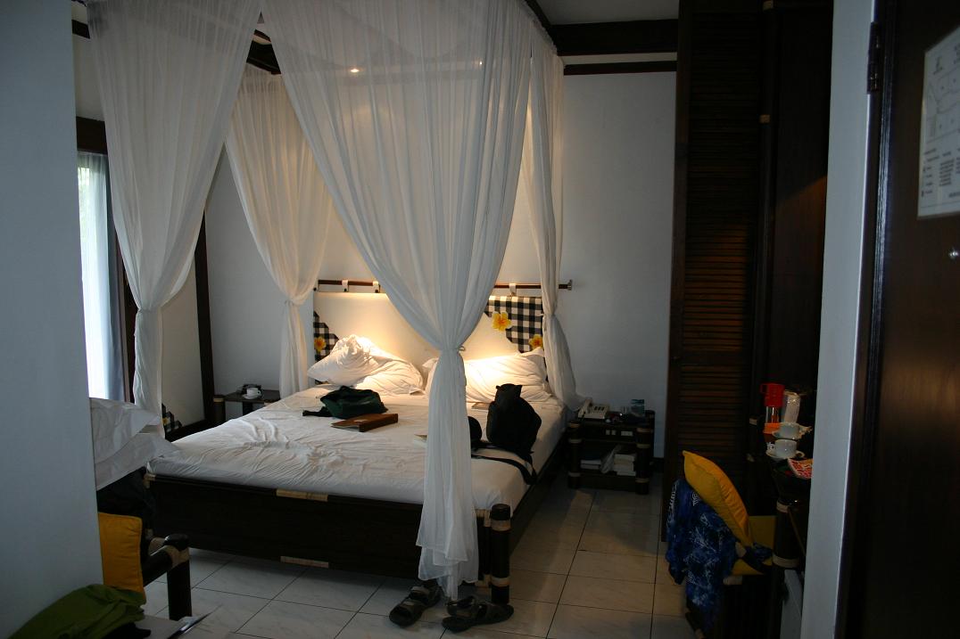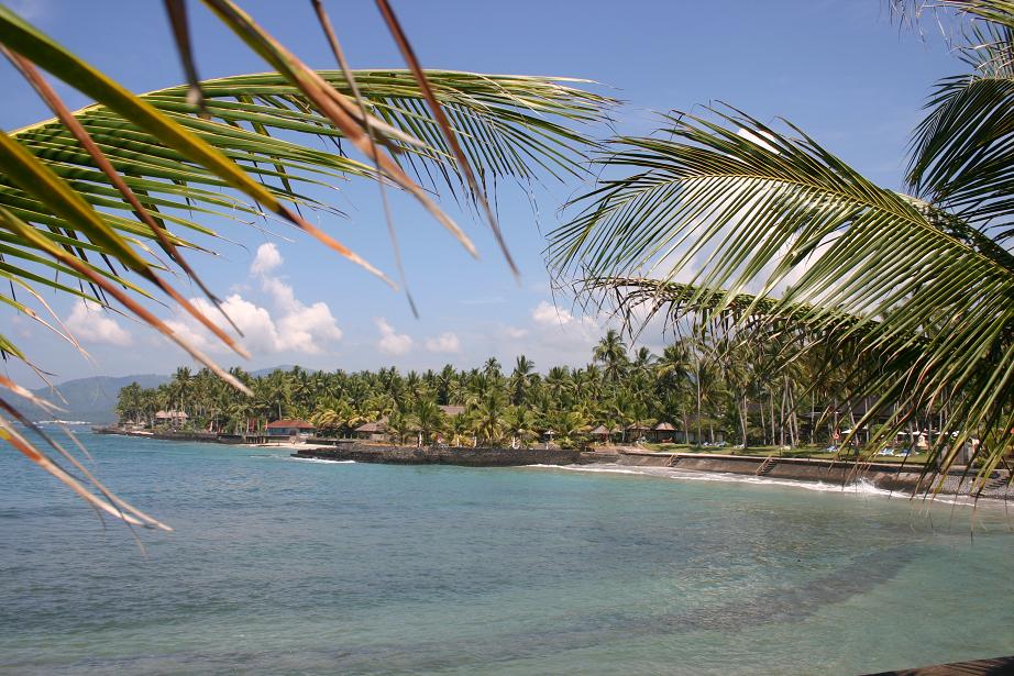 Der Flug nach Bali ist lang, und schon gleich beim Abflug in HH traten die ersten Schwierigkeiten auf- Nebel in Frankfurt- die Maschine aus HH musste warten. Als es endlich los ging waren wir froh. Gerade noch schafften wir es den Flieger von Singapure Airlines zu erreichen. Weiter ging es sodann über Singapure nach Denpassar. Der Flug war – sofern man das für die Economyclass sagen kann, ertragbar. Sehr freundliches Personal, akzeptables Essen und auch mit der Diät für meinen Sohn (glutenfrei) hatte es geklappt. Ziemlich k.o. kamen wir in Denpassar an. Bis Candidasa, unserem im Osten der Insel liegenden Urlaubsort, sind es rund 1 ½ Stunden Fahrt mit dem Taxi. Am Flughafen gibt es Festpreise. Wir sind k.o. und haben auch keine Lust auf Handeln. 300.000 Rupiah kostet die Fahrt. Der Kurs steht momentan zwischen 11.300 Rupiah (Umtausch am Flughafen) – 11.850 Rupiah für 1 Euro. Die ersten Eindrücke rauschen an mir vorbei. Nichts besonderes, eine asiatische Stadt, wie ich sie schon häufiger gesehen habe. Das ist nun meine Trauminsel Bali? Der Taxifahrer fährt wie eine… na ja, ihr wisst schon. Er jongliert uns zwischen knatternden Mopeds, umrundet kleine Frachtlaster…Läden rauschen vorbei. Manchmal eröffnet sich auf der rechten Seite der Straße ein Blick auf das Meer. Die ersten Eindrücke der dortigen Strände ernüchternd. Fischerboote, Dreck….Dann sind wir in Candidasa. Das ist ein echter Straßenort, zieht sich über mehrere Kilometer hin. Es gibt eine Tempelanlage, eine Lagune. Restaurants, ein paar Hotels etc. , Läden. Das war es. Das Candi Beach Cottage, in dem wir die nächsten 14 Tage verbringen werden, liegt abseits der Straße direkt am Meer. Wir haben gebucht über HotelTravel.com. Das Hotel wird auch bei Hotelclub.net angeboten, aber erstere waren billiger. Es hat einen gehobenen Standard und die Anlage ist wirklich sehr schön und gepflegt. Einen richtigen Strand gibt es in Candidasa nicht. Leider hat man jahrelang das vorliegende Korallenriff zerstört, und dadurch ist dann der Strand abhanden gekommen. Heute hat man einige Betonringe als Wellenbrecher vorgelegt – vor unserem Hotel aber kaum zu sehen. Bei Ebbe wird ein Sandstreifen frei. Vor dem Hotel gibt es noch Korallen und man kann schnorcheln. Unser Zimmer, in dem wir zu dritt schlafen, ist freundlich eingerichtet.Den ersten Nachmittag erkunden wir das Hotel, gehen schwimmen, essen im Hotel und schlafen danach 14 Stunden. In Bali ist die Zeit uns 7 Stunden voraus.