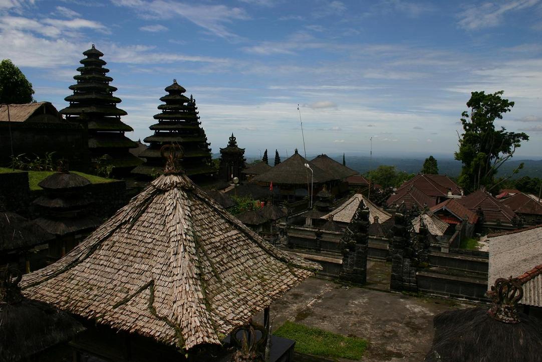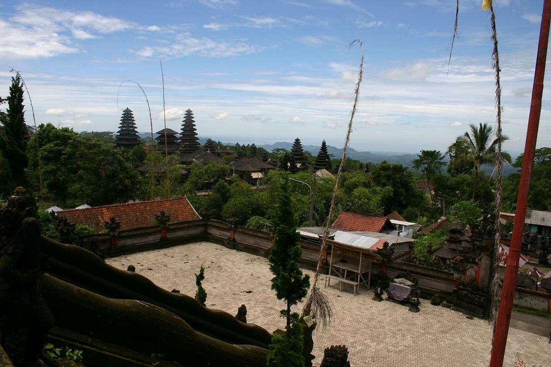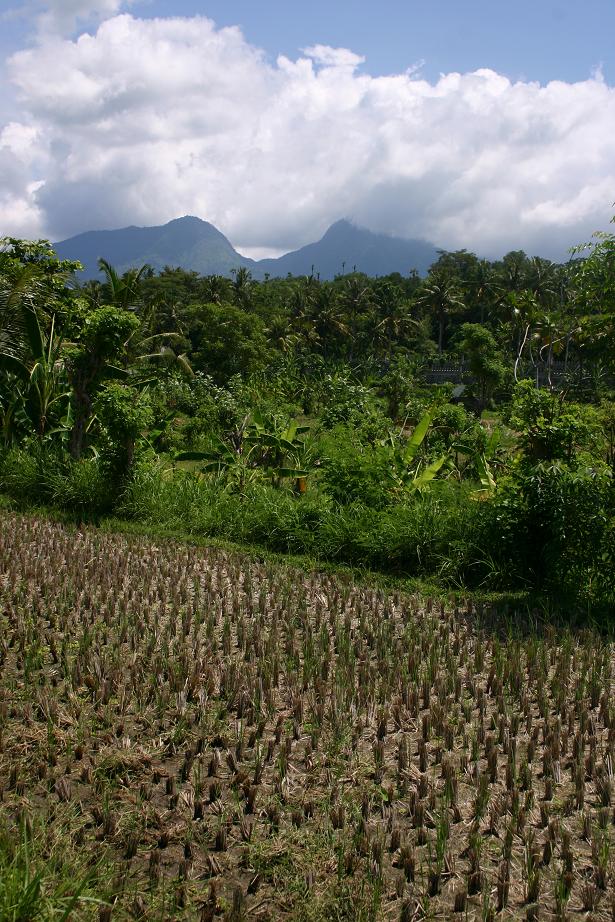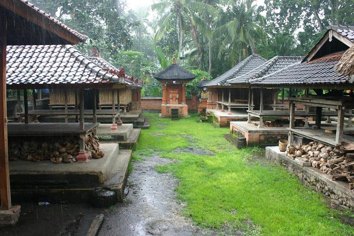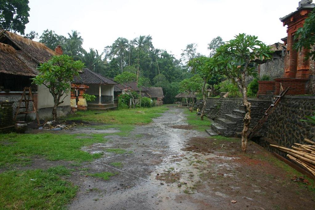 Nach der ersten Tour bekamen wir Kontakt zu einem anderen Fahrer, dessen balinesischer Name so lang ist, dass man ihn sich nicht merken kann, aber auch YAN enthält, so dass wir ihn einfach Yan nennen sollten. Mit ihm haben wir alle weiteren Touren gemacht und können ihn wärmstens weiterempfehlen. Er hat uns sehr viel über die Insel erzählt und schnell gemerkt, dass wir vor allem Landschaft sehen wollten. Mit der ersten Tour mit ihm erkundeten wir die „Inselnase“, die oberhalb Candidasas liegt, einschließlich des Aga-Dorfes Tenganan, welches nur rund 15 km von Candidasa entfernt ist. Dieses Dorf ist eine in sich abgeschlossene Gemeinde. Im Reiseführer ist nur die Rede von einem Dorf, unser Fahrer meinte aber, es gäbe zwei – eines, welches noch sehr traditionell sei, und eines, welches durch den Tourismus nicht mehr so streng wäre. Er brachte uns in das traditionelle. Gerade zu diesem Zeitpunkt machte sich die Regenzeit heftig bemerkbar. Das Dorf ist mit einer Mauer umschlossen und nachts dürften sich dort keine Fremden aufhalten. Es wohnen dort ca. 570 Menschen, die zur Regierung in Bali und Indonesien insgesamt in vielen Bereichen autark und autonom sind. Wer dort lebt, muss jemanden aus dem Dorf heiraten oder das Dorf verlassen. Der Dorfrat bestimmt vieles und setzt sich aus allen verheirateten Paaren zusammen. Die Bewohner des Dorfes leben von Anbau als Bauern, flechten Körbe und unterhalten Webereien. Es ist der einzige Ort Südostasiens wo eine bestimmte Webart hergestellt wird, die so genannten “Geringsing-Doppel-ikat-Textilien“. Man geht nicht alleine durch das Dorf, sondern wird durch einen Führer geleitet, nachdem man am Dorfeingang eine Spende hinterlassen hat, die jeder selber bestimmen kann. Diesmal hatten wir einen Führer, sehr umfangreich das Leben im Dorf erklärt hat – bei strömenden Regen! Irgendwie war das schon lustig. Die ersten beiden Fotos(von Okke Behm) kommen vom diesem Dorf.