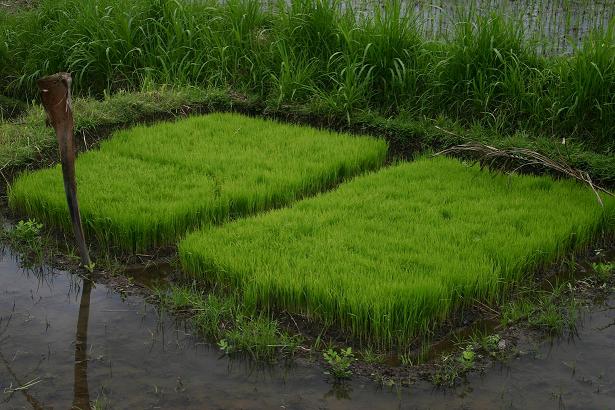 Foto 1 Jungpflanzen Foto 2 Nach der Umsetzung Foto 3 Reisfeld nach der Ernte Foto 4 Ausklopfen der Reiskörner -