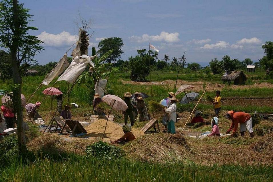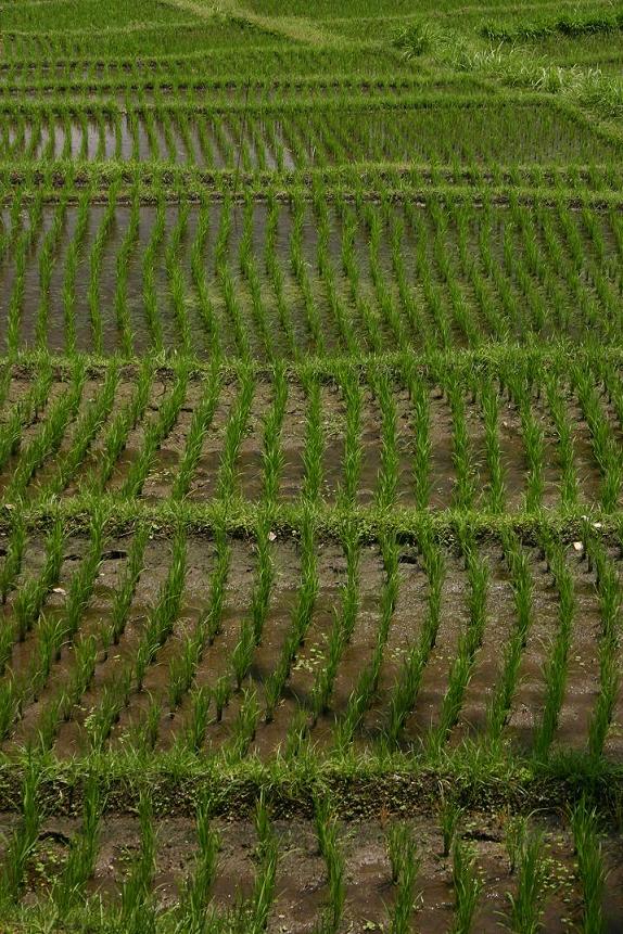 Das Besondere an Bali sind die Reisterrassen. Dort wird einem dann auch bewusst, wie unglaublich mühsam der Reisanbau ist und man kann gar nicht glauben, dass das Endprodukt so billig ist. Die Reissaat kommt zunächst in ein geschütztes Beet. Man erkennt die Jungpflanzen gut auf dem Foto: Dicht und giftgrün. Der Bauer bereitet das Pflanzbecken durch Fluten, Flügen und Ebnen vor. Siehe Foto mit den Rindviechern. Das Umsetzen der Jungpflanzen geschieht per hand. Wenn man die riesige Menge an Reisfeldern mit Millionen von Pflanzen sieht, ist die dahinter stehende Arbeit unvorstellbar! In bestimmten Stadien werden die Felder wechselnd geflutet und trockengelegt, um den Wuchs zu fördern. Während dieser Zeit werden sie auch rregelmä0g gejätet. Geerntet wird der Reis, indem die Halme mit einem kleinen in der Hand verborgenen Messer geerntet werden, damit sich die Reisgöttin nicht ängstigt. Ertragreiche Reissorten werden sodann vor Ort gedroschen – siehe Foto - und in Säcken zur Reismühle. gebracht. Andere Sorten bleiben auf dem Halm und werden bis zum Gebrauch so in einer Scheune verwahrt. Nach der Ernte werden die Felder abgebrannt. Die dabei entstehende Asche soll den Boden schützen. Unser Fahrer erzählte zudem, dass es auch so etwas wie einen Fruchtwechsel gibt, also auf den Feldern zwischendurch etwas andere gepflanzt wird, wie z.B. balinesischer Spinat.