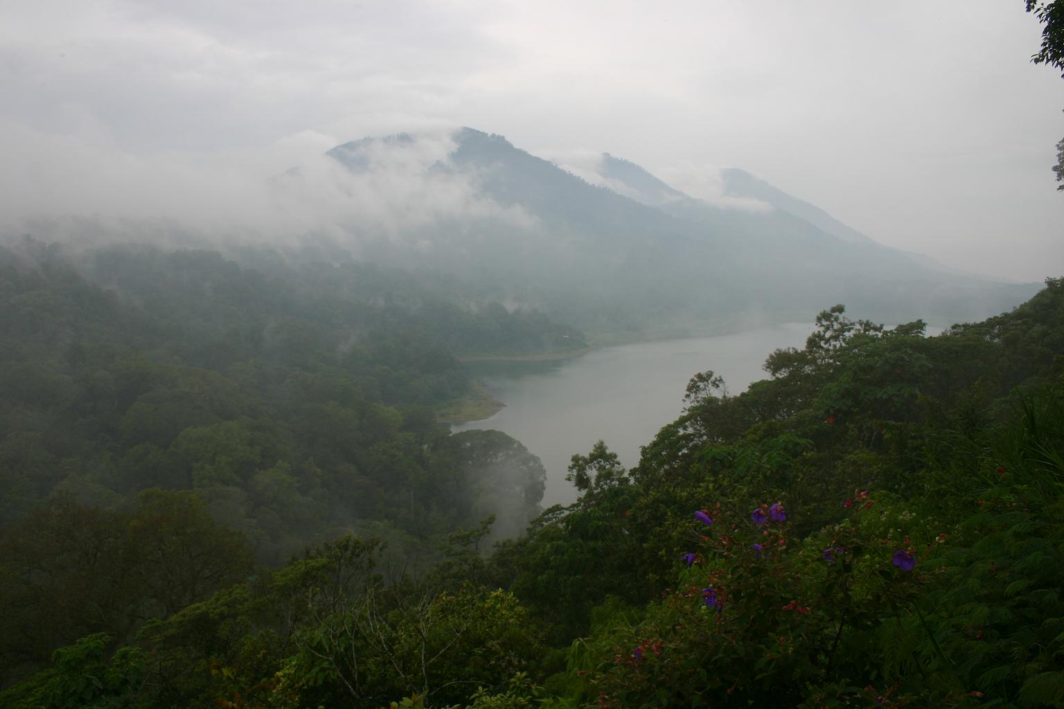 Eine weiterere Tour führte uns in den Nordosten an den Batur-See.Erneut ging es zunächst hoch in die Reisterrassen. Unterwegs saßen Affen am Straßenrand. Der Batur-See liegt direkt neben einem weiteren Vulkan, dem Gunung Batur. Gunung bedeutet „Berg“. Er ist der aktivste Vulkan Balis und man sieht es dort hin und wieder qualmen. Man erkennt auch noch einen Lavafluß vom letzten Ausbruch. Unser Fahrer wählte eine hoch gelegene Straße, von der aus man einen herrlichen Blick auf den See und den Vulkan hatte.