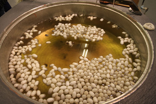 Der Meister zeigt uns wie man diese Konkons aufbereitet, und wie dabei die Seide herauskommt und wie sie aufgewickelt wird. Diese vielen Techniken sind schon sehr beeindruckend.