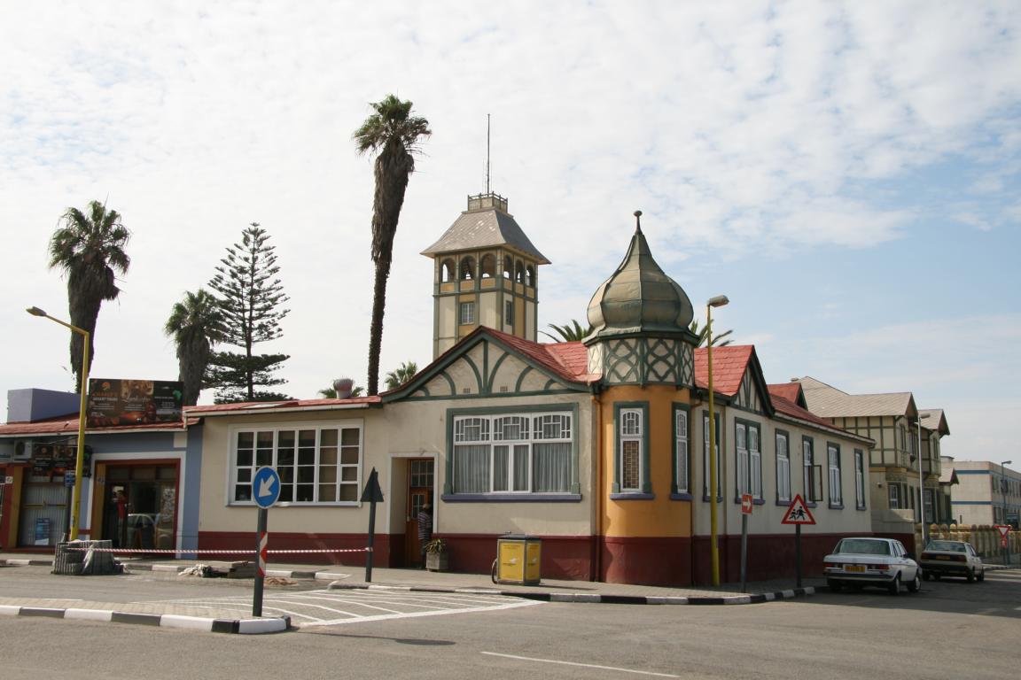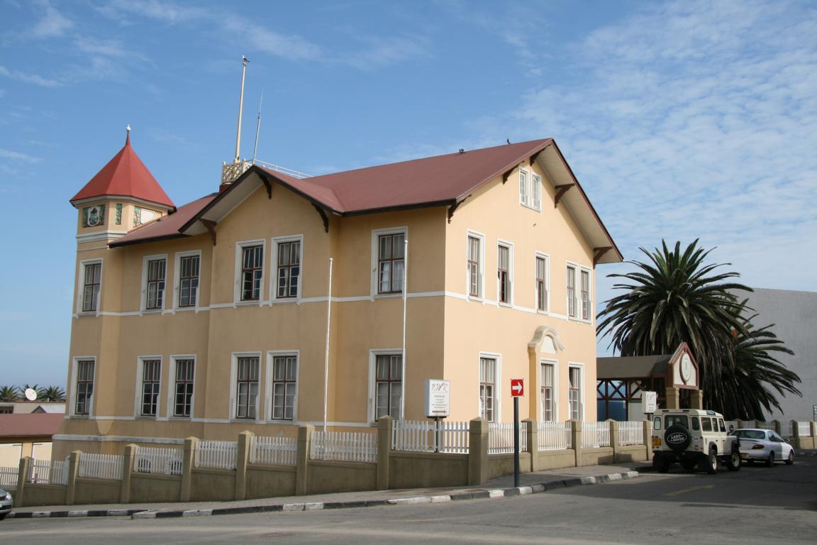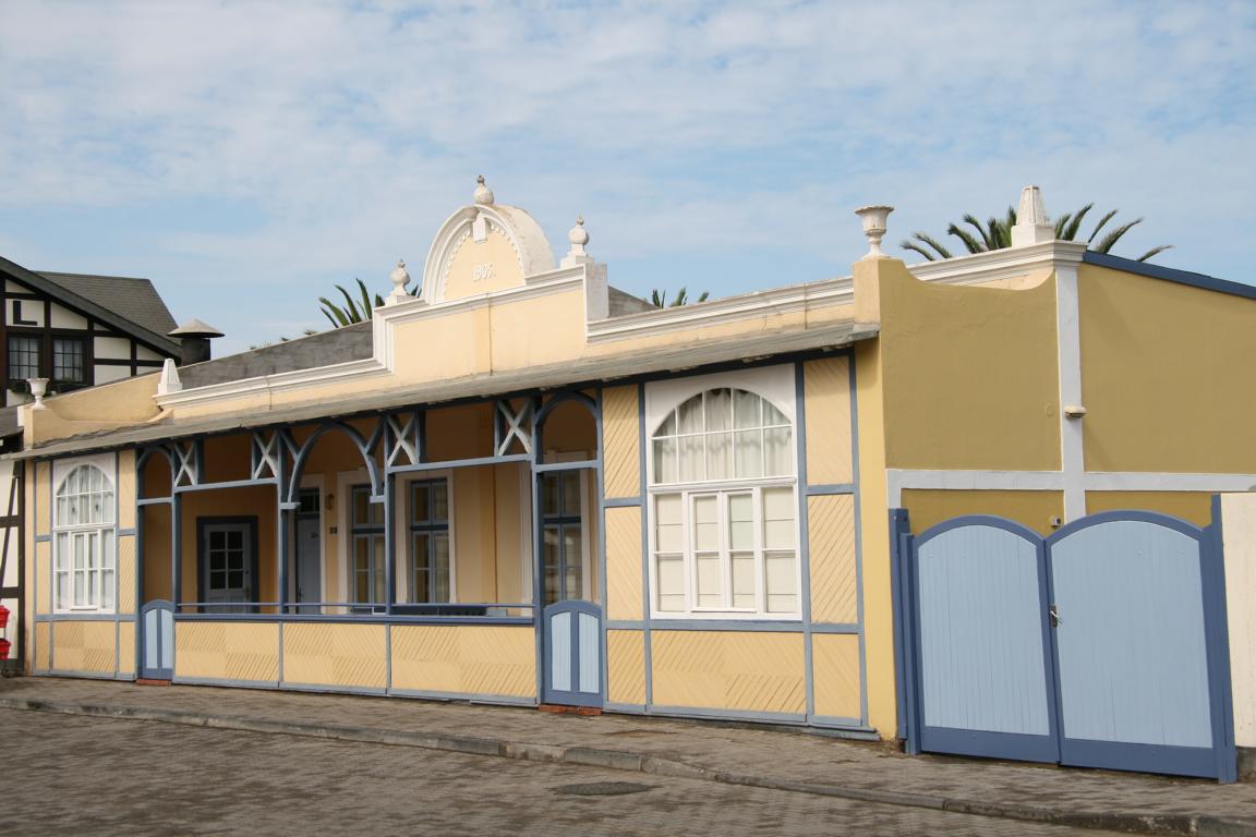 Es gibt wieder ein wunderbares Frühstück. Danach starten wir unseren Rundgang durch Swakopmund. Wir stellen das Auto nahe der Bismarkstraße ab. Dann geht es rechts in die Bismarkstraße. Dort steht das Woermannhaus. Es ist eines der ältesten Gebäude in Swakopmund und wurde 1894 für den Hamburger Spediteur Woermann errichtet. Seit 1921 war es in südafrikanischer Verwaltung und wurde 1924 bis 1972 als ein Jugendheim genutzt. Seit 1971 ist es ein Baudenkmal und zwischenzeitlich schön restauriert.