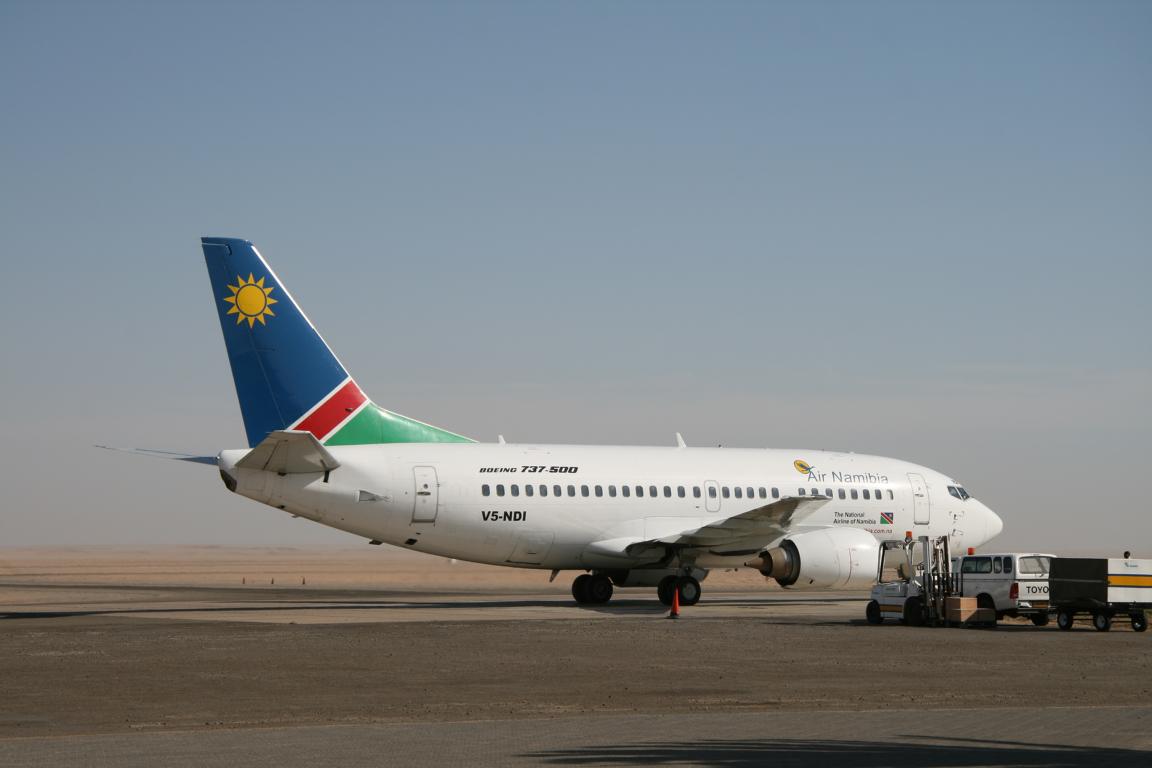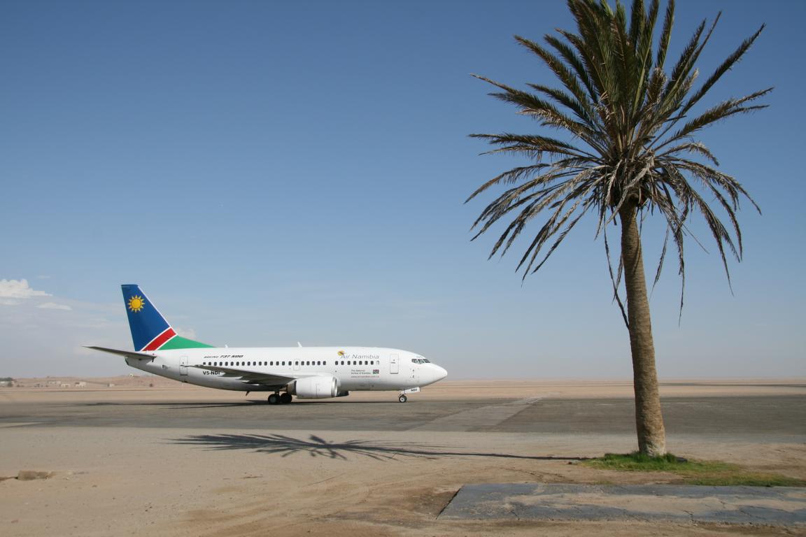 Ach ja, und Walvis Bay hat einen Flughafen – der liegt ca. 10 km außerhalb mitten in der Wüste – viel Flugverkehr ist da nicht – doch gerade als wir dort halten, kommt eine Air Namibia angeflogen – unglaublich. Okke freut sich.