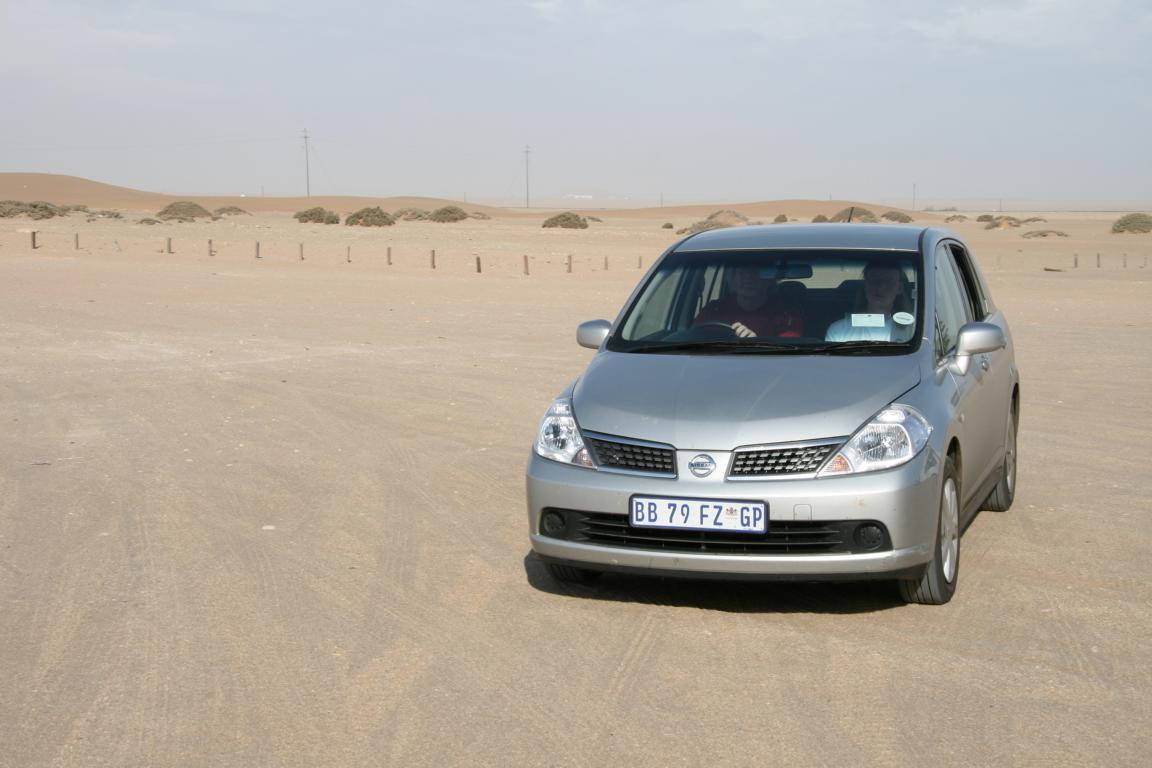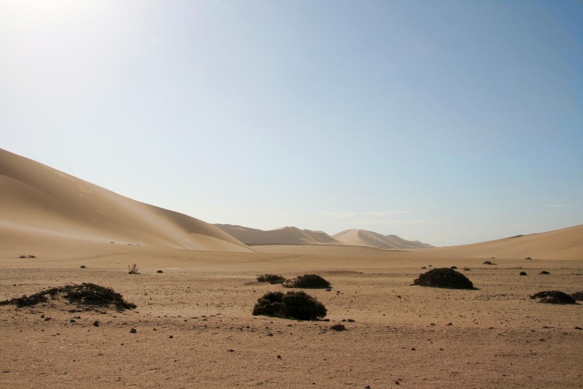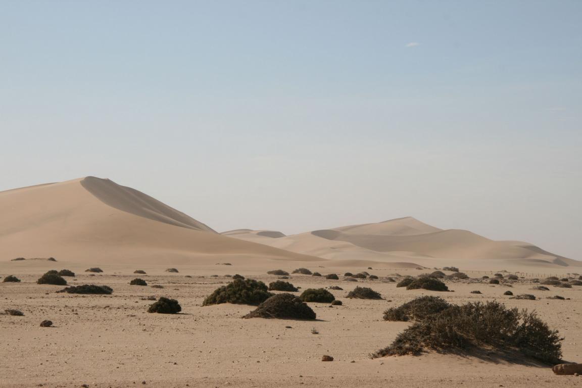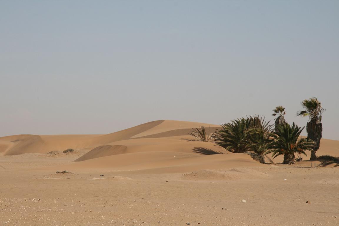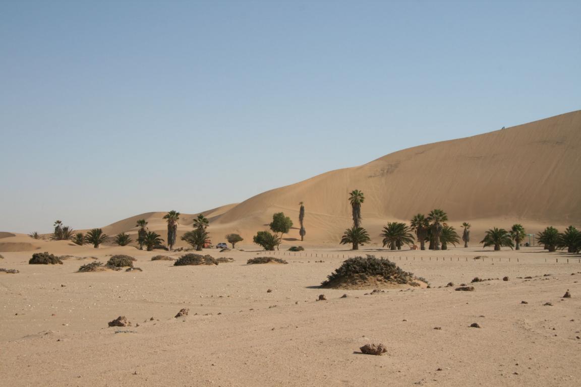 Wir drehen und fahren wieder Richtung Walvis Bay. Da zweigt eine Straße rechts ab, die Richtung Swakopmund anzeigt, und wir denken, wir können ja mal eine andere Route nehmen- Diese führt an einer riesigen Düne vorbei, die den Namen Düne 7 trägt – sie liegt wohl 7 km hinter Walvis Bay. Man darf diese Düne besteigen, aber wir verzichten.