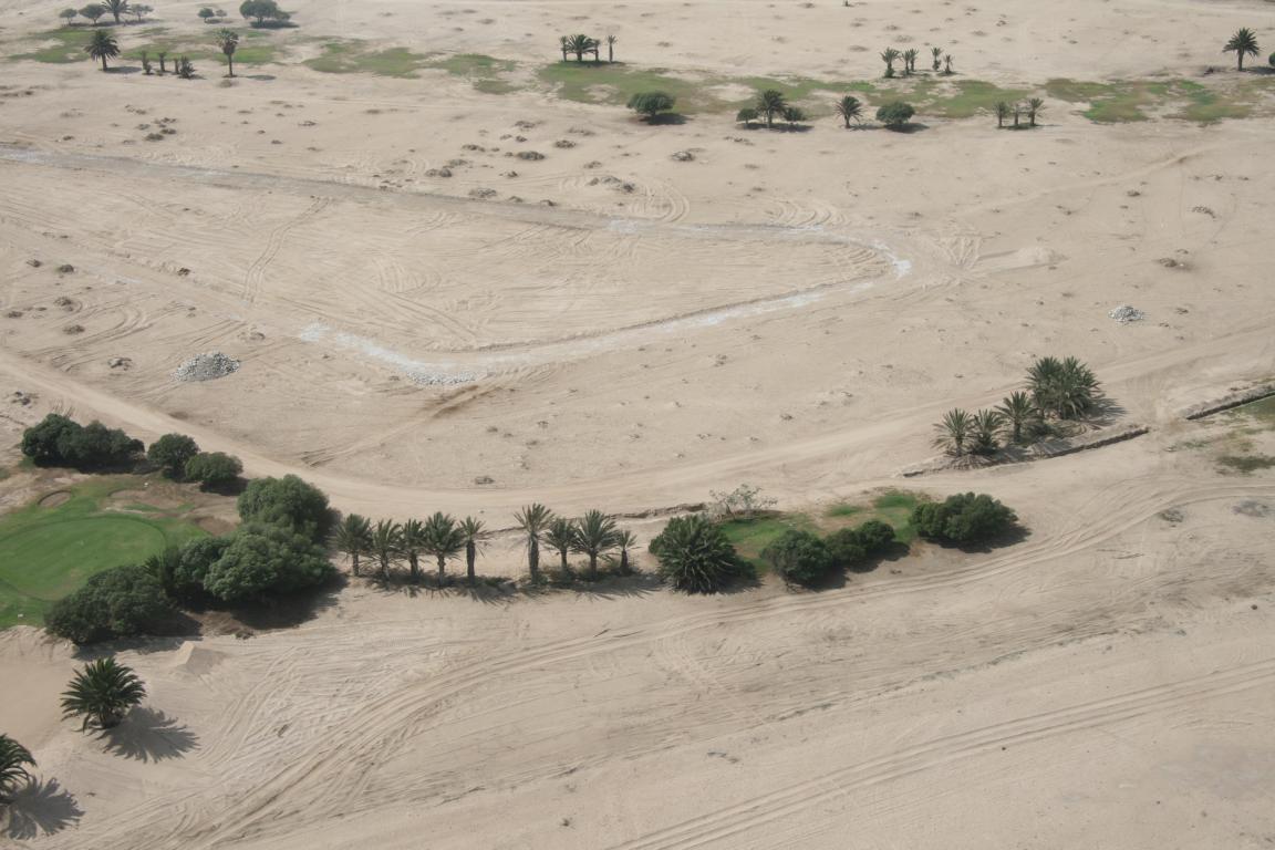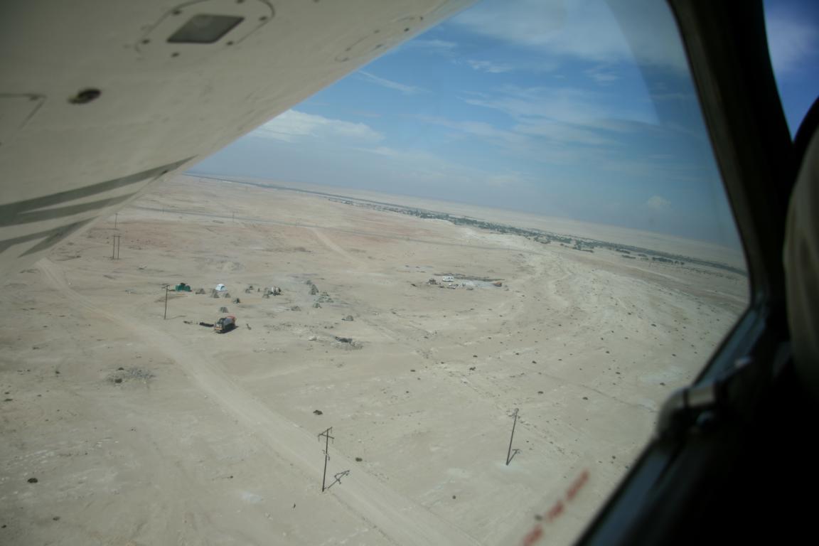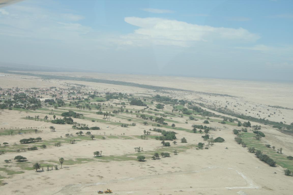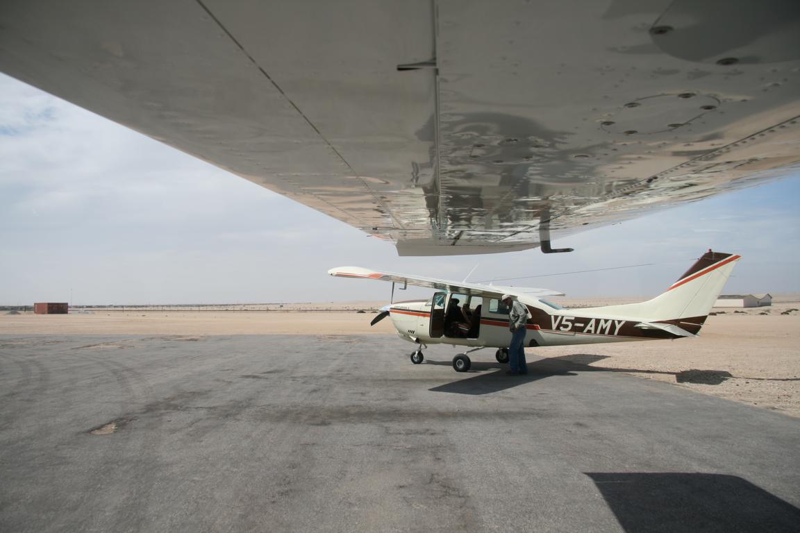 Ich bezahle schon mal das Zimmer. Dann sagt uns Hans-Jürgen Bescheid, dass wir bereits um 14.30 Uhr abgeholt werden. Also stehen wir rechtzeitig an der Straße. Wir sind die ersten, weitere werden eingesammelt, wobei zweimal keiner kommt. Einmal wird das Hotel nochmals angefahren, und dann steigen zwei Leute ein. Es geht zunächst zum Büro – dort erhalten wir unsere Tickets, ein Zertifikat und eine DVD. Dann kommt ein älterer Herr mit Enkel und es stellt sich heraus, dass das die „Vemissten“ weiteren Mitreisenden sind, denen man wohl nicht mitgeteilt hatte, das es früher losgeht. Alle zusammen steigen wir wieder in den Bus und fahren zum Fugplatz Swakopmund. Dort stehen noch etliche andere Passagiere und viele Flieger – vermutlich von den anderen Anbietern. Wir haben Glück, denn in unserer Maschine fliegen nur vier mit. Okke sitzt ganz hinten und kann so auf beiden Seiten fotografieren, Jan und ich in der Mitte, vorne der Pilot und ein Südafrikaner.