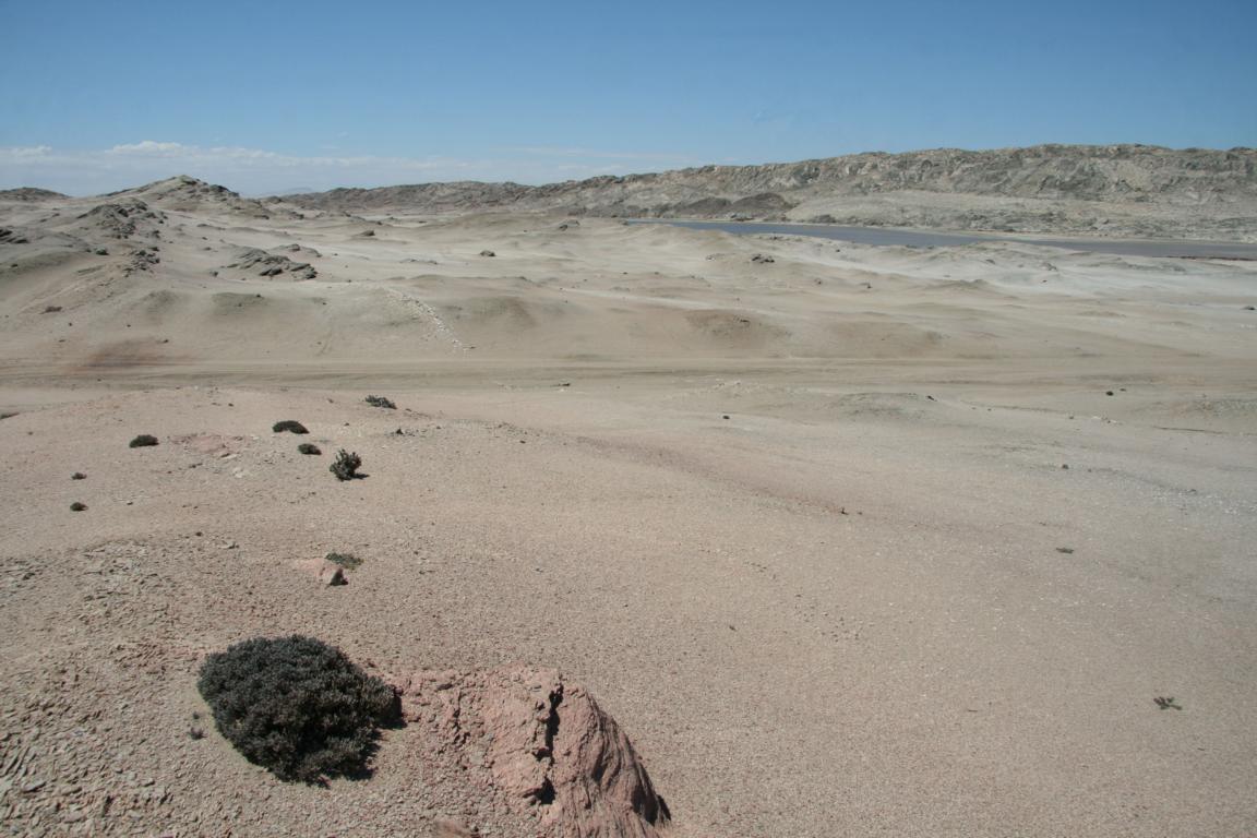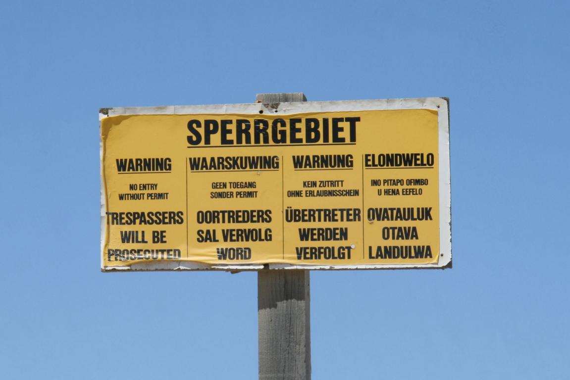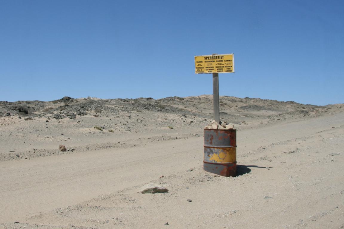 Wir starten nun eine Rundfahrt auf der Lüderitzhalbinsel. An der Straße der deutliche Hinweis, dass wir das Gelände links der Straße nicht betreten dürfen, da es nach wie vor Sperrgebiet ist. Dahinter liegen die Diamantenschürfgebiete. -