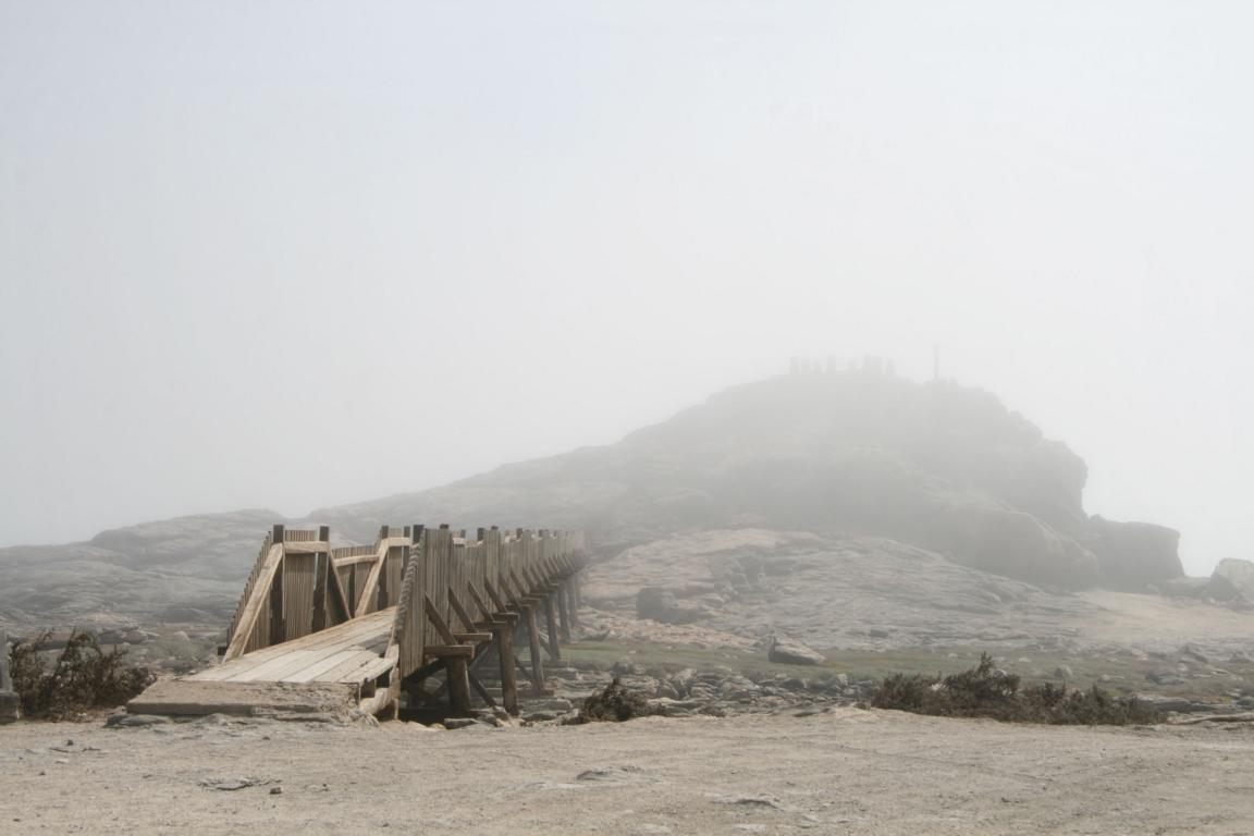 Das Kreuz steht auf einem Felsen, zu dem eine Holzbrücke führt. Dort auf dem Felsen scheint die Temperatur um 20 Grad niedriger zu sein und der Nebel kommt immer näher und tiefer. Im Wasser ein weiterer Fels, auf dem sich Ohrenrobben wälzen, die man deutlich brüllen hört.