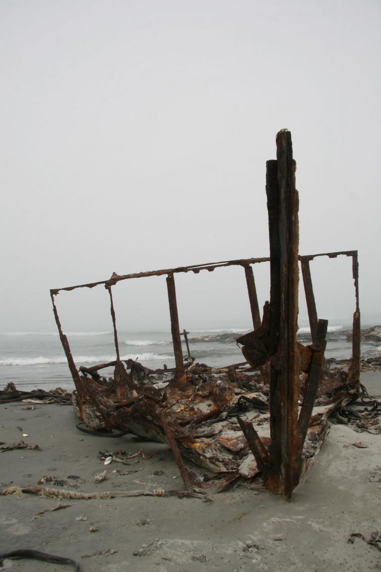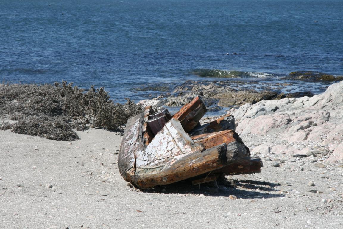 Wir fahren noch ein Stück weiter, zunächst zu einer Bucht, die Fjord heißt und zu der wir die Anfahrt abbrechen und nur Fotos vom Hügel aus machen, und dann weiter zur großen Bucht, von der aber wegen der Seenebel nichts zu sehen ist. Nur ein Schiffswrack bietet sich uns zum fotografieren an.