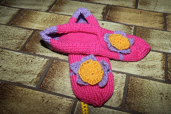 Die Puschen selber waren schnell gestrickt, aber mit den Blüten haben wir uns rumgeschlagen, denn auch Friedrich musste helfen. ![]()