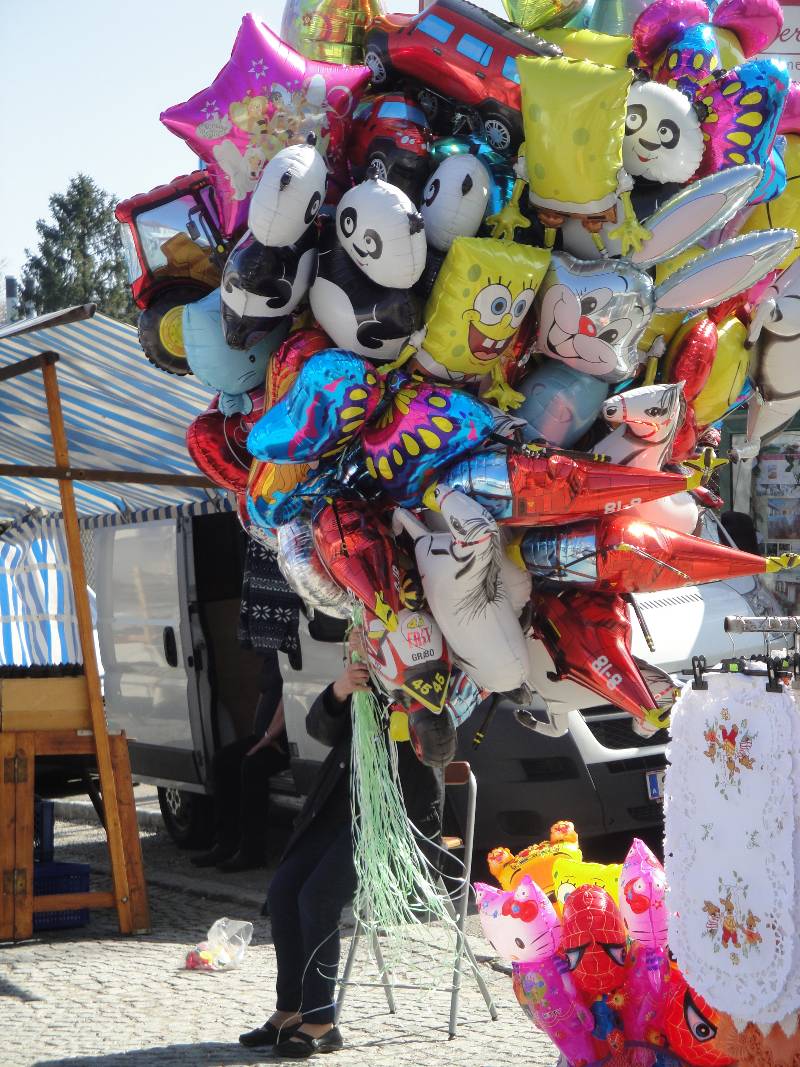 Bei der Kirche in der Wachau war auch Kirmes und da war diese Frau mit den vielen Luftballons und einer ist Spongebob.