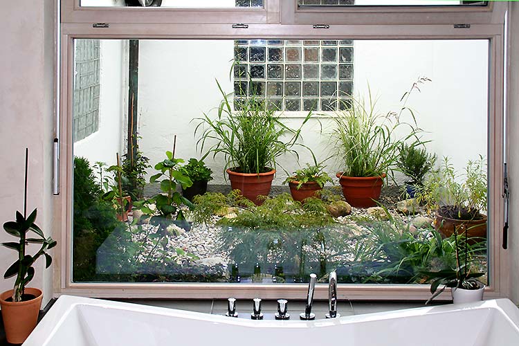 Das Badezimmerfenster geht in einen Innenhof, wo keiner reinschauen kann. Wir wollen vor dem Fenster ( 2m breit x 1,7 m hoch) einen balinesischen Garten anlegen, dass man das Gefühl hat, der Garten ist mit im Bad. Auf Bali sind ja die Bäder auch meistens im freien. Wir sind gerade beim Anlegen dieses Gartens. Es fehlt aber noch einiges. Wenn ich wieder aus England zurück bin, stelle ich ein Bild rein.