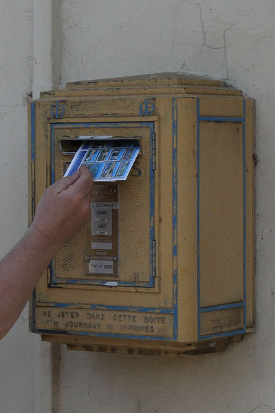 Wir fanden endlich einen Briefkasten, um die Forums-Postkarte aus Lyon einzuschmeißen.