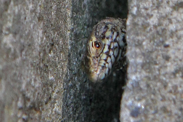 In einer Mauerritze sehe ich eine Eidechse... aber eigentlich ist sie viel zu klein, aber sehr neugierig.