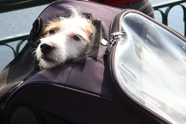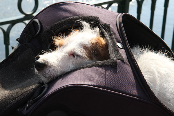 Wir machen eine Pause und beobachten einen Motorradfahrer, der mit seinem Hund unterwegs ist. Ich darf ein Foto machen und der Besitzer erzählt mir, dass sein Hund überall in dem Tankrucksack mitkommt, aber in kein Auto einsteigt