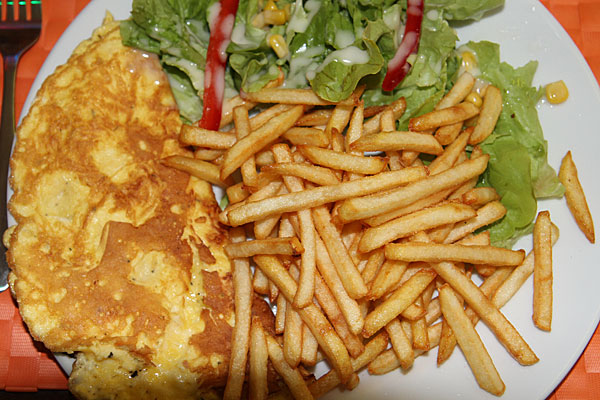 Wir fanden ein winzig kleines Lokal und bekamen einen super leckeren Snack... Für mich als Vegetarier gab es laut Speisekarte nichts, aber ein Omelette mit Pommes ging dann doch...