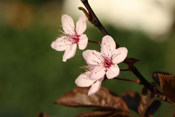 Die Zierpflaume hat kleine rosa Blüten. Der Baum wird 5-7 m hoch, die Blätter sind dunkelrot. Früchte hat der Baum bisher noch nicht getragen.