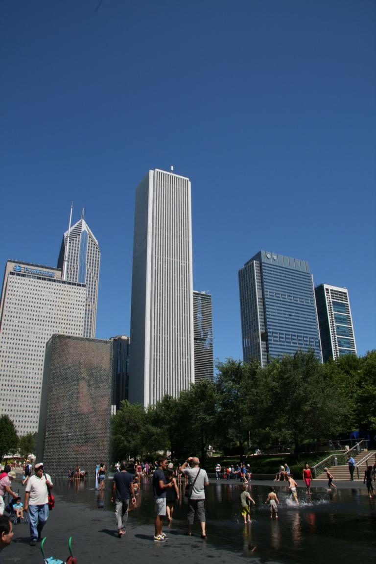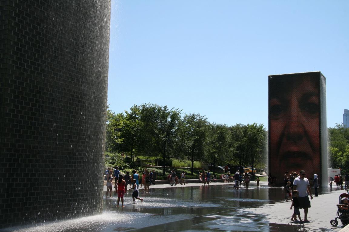 Eine weitere Attraktion des Parkes ist die „Crown Fontain“. Sie besteht aus zwei circa neun Meter hohen Glassteintürmen und wurde von dem katalanischen Künstler Jaume Plensa konzipiert. Hinter den Glassteine sind als Video wechselnde Gesichter von ca 1000 Einwohnern der Chicagos auf LED-Bildschirme zu sehen. Bevor ein neues Bild erscheint spritzt Wasser aus dem projizierten Mündern. Leider ist mein Bild von dem Moment, wo das Wasser herauskommt, nicht gelungen. Aber das ganze ist ein großes Gaudi vor allem für die Kinder und an solche warmen Tagen wie heute