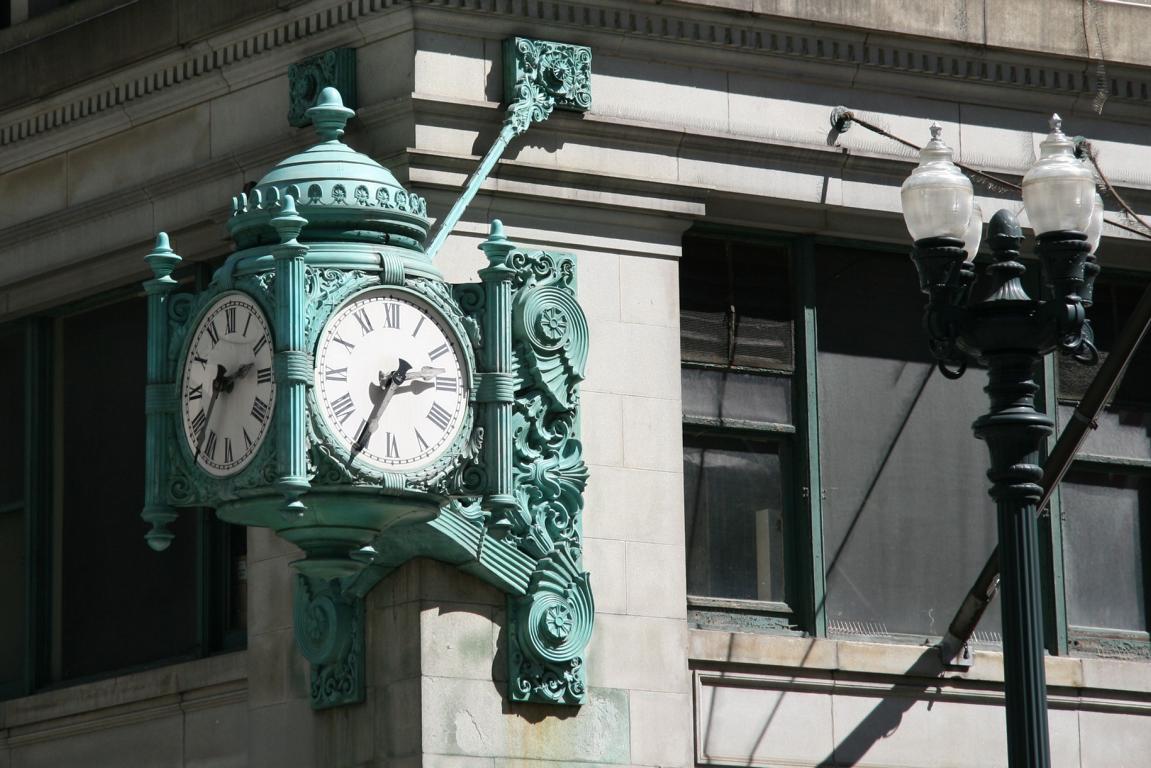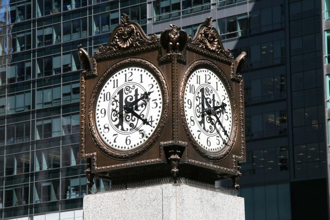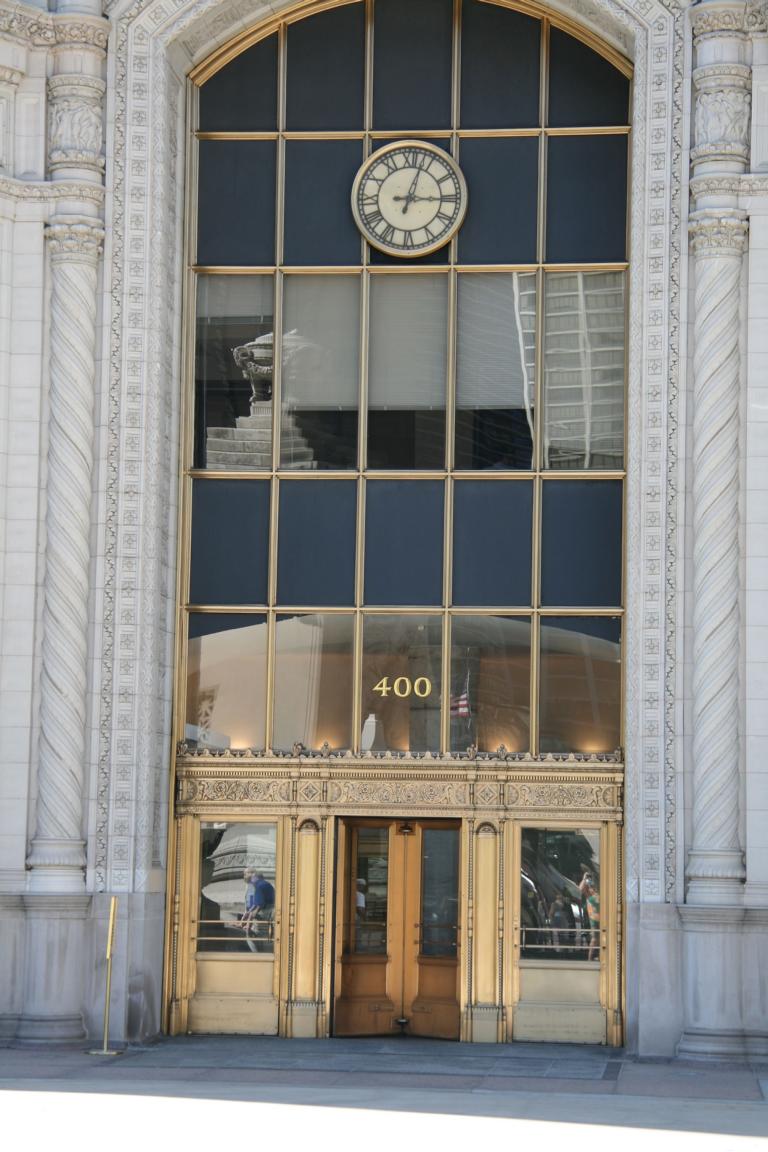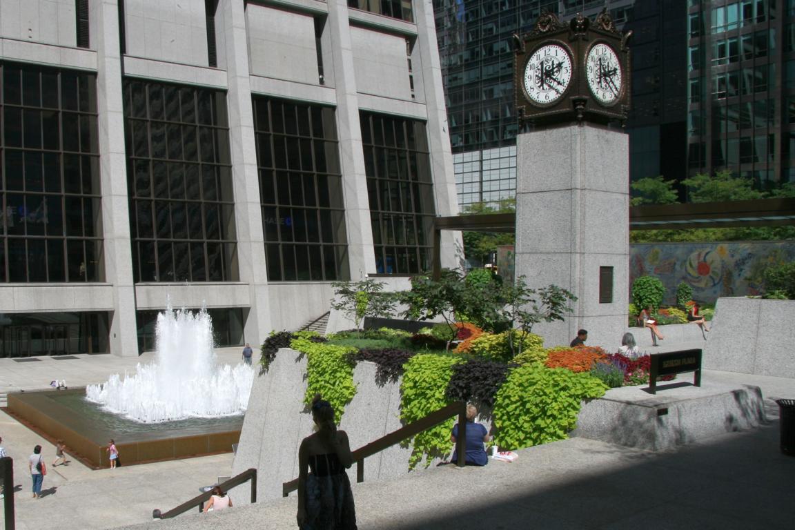 Für uns geht es nun wieder abwärts. Wir laufen über die Exelon Plaza, wo es verschiedene Ebenen gibt mit einem Brunnen, einer Uhr und - ich bin dran vorbeigegangen, habe es aber nicht erkannt - eine Mosaikwand von Marc Chagall "Die Vierjahreszeiten" - ich sage Euch, ich habe mich gewundert was diese merkswürdig bemalte Wand darstellen sollte.... dabei mag ich Chagall
