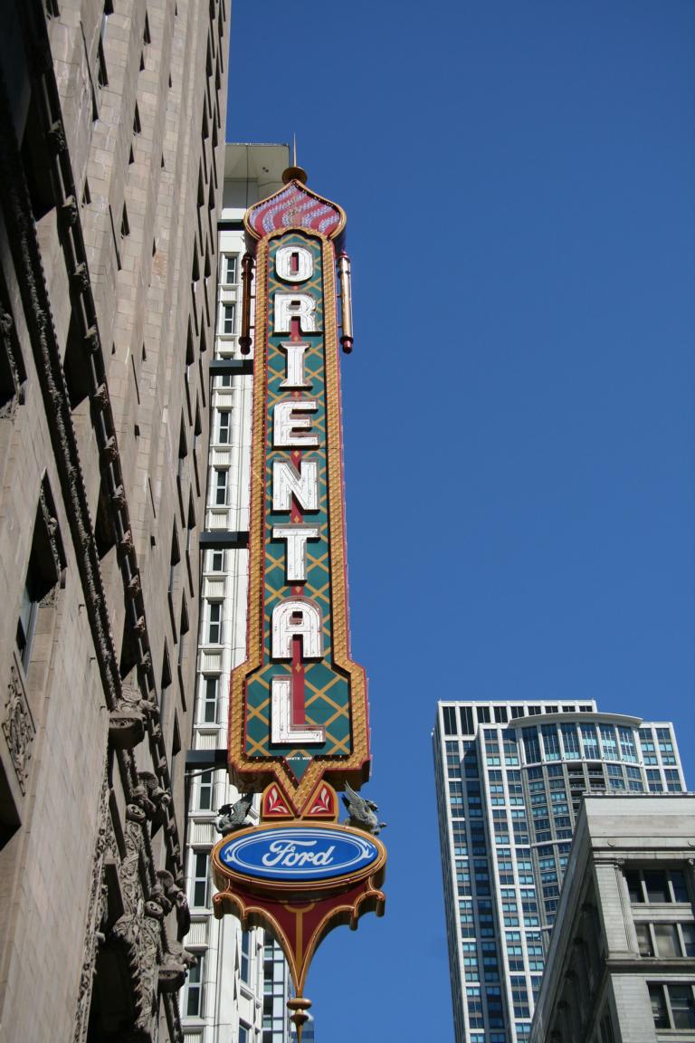 Wir kommen in den Theaterdistrikt und wir werden auf verschiedene Gebäude hingewiesen - ein altes Kino, ein altes Theater