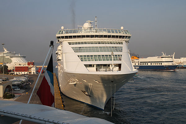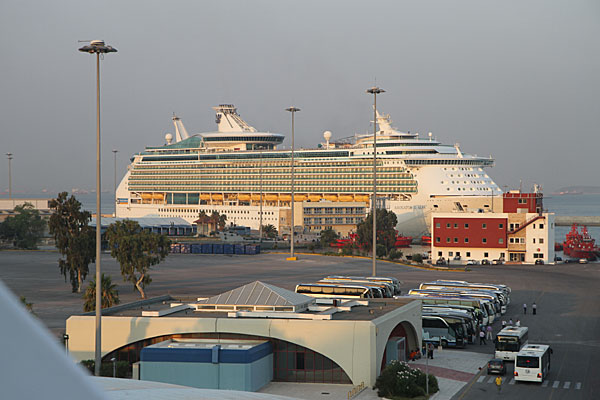 Es ist der 6. Tag unserer Seereise als wir pünktlich um 7 Uhr Piräus erreichten. Hier treffen sich die Giganten der Kreuzfahrtschiffe. Wir sehen ein Schwesternschiff der RCCL, eine Costa, die Volendam, und die Queen Victoria, neben