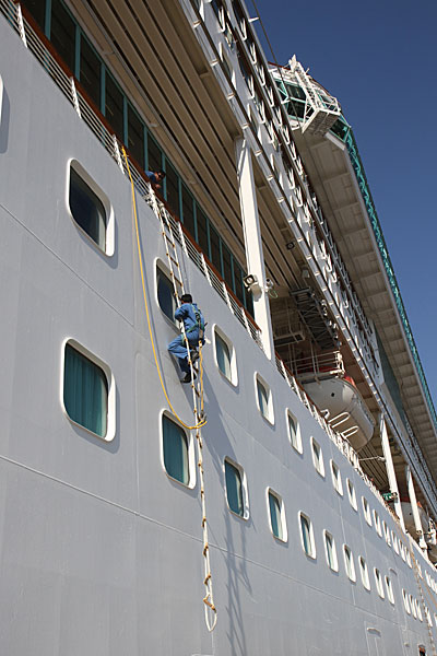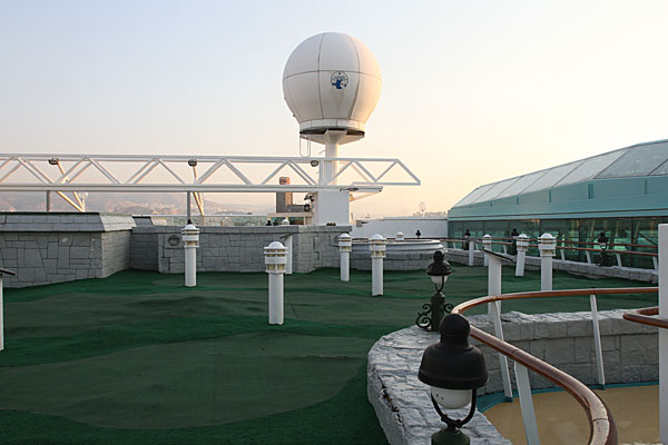 Wir frühstücken erst in Ruhe und machen einen Rundgang auf dem obersten Deck. Um diese Zeit ist kaum jemand unterwegs. Neben einer Kletterwand gibt es auch einen Minigolfplatz und ein Shuffle-Board.