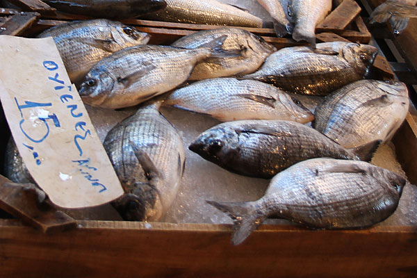 Danach gehen wir noch eine Runde. Gemüse und Obst wird direkt vom Schiff aus angeboten. Auf dem Fischmarkt warten