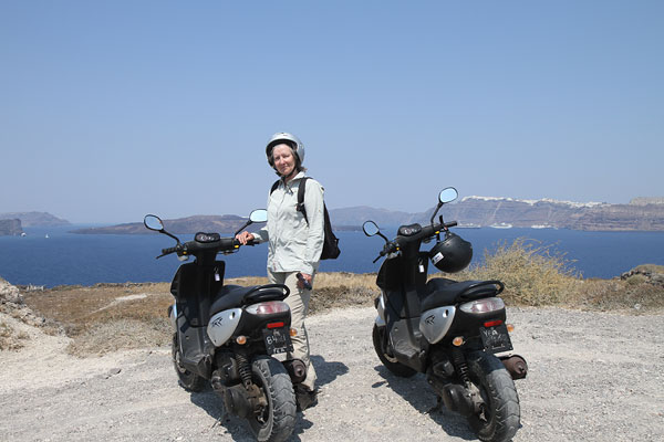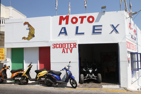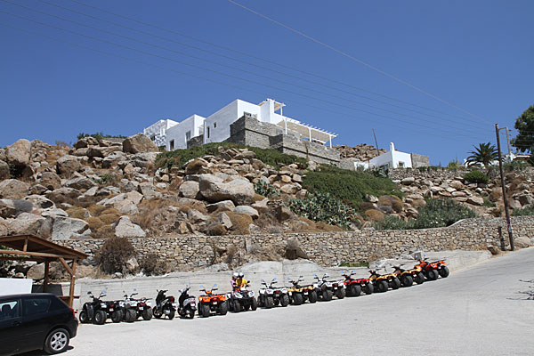 Hier auf der Insel ist wohl das Quad die ultimative Alternative, wir wollen aber lieber einen Roller leihen. Im ersten Laden, sagt man uns 20 Euro pro Gerät und Tag. Na gut, das hatten wir ja auch auf Mykonos bezahlt. Mit Sicherheit überhöht, aber wir wollen fahren und nicht weitersuchen.