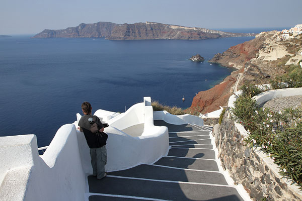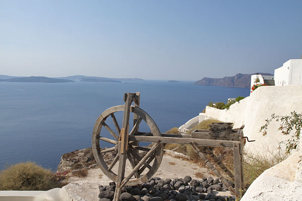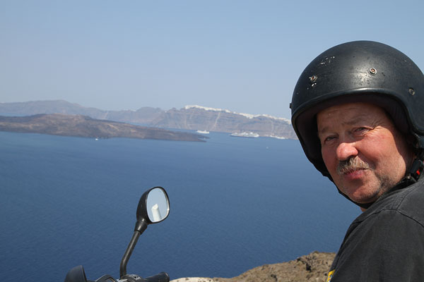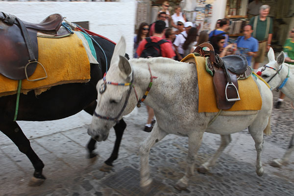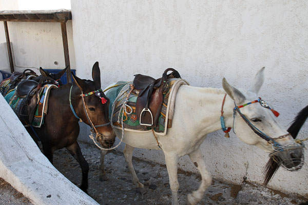 Oben in Fira angekommen, genießen wir den ersten Blick auf den Krater. Ja, hier gefällt es uns. Wir suchen uns als erstes einen Motorradverleiher. Dabei komme ich hautnah die Esel zu spüren, die sich die engen Gassen hinaufwinden. Immer mehr kommen vorbei. Sie haben Vorfahrt und wir müssen warten.