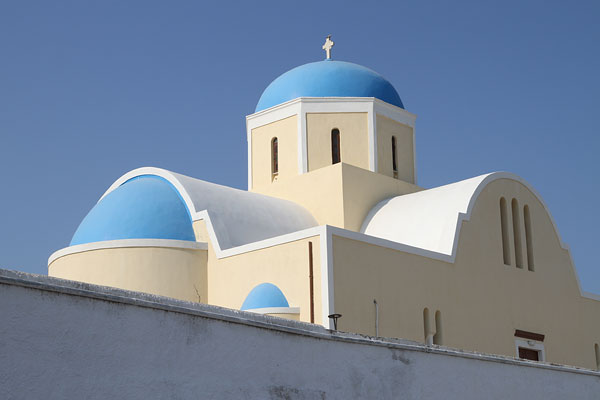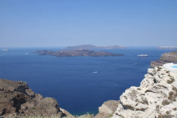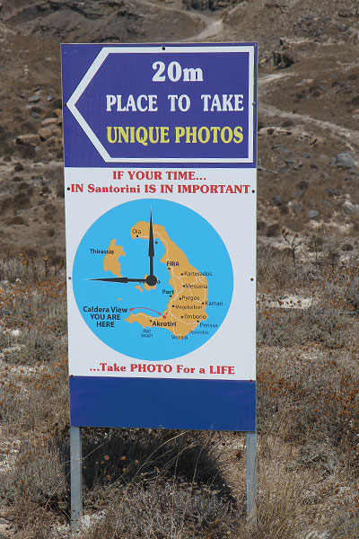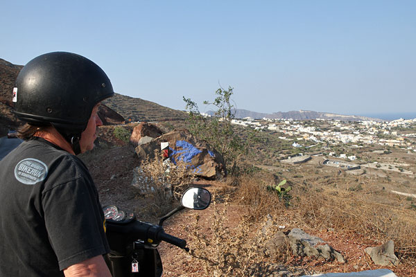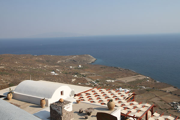 Dann fahren wir auf kleinen Wegen über Pyrgos in die Nähe von Acrotiri. Hier gibt es den angeblich schönsten Blick auf die Caldera. Leider dürfen nur "Customer" schauen. Aber wir haben gerade gegessen und getrunken und wollen nicht schon wieder.