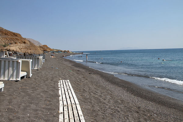 Der Weg nach Faros ist irgendwie unverständlich ausgezeichnet. In jedem Fall landen wir nicht dort, sondern an der Pertissa Beach. Hier gibt es den schwarzen Lavasand. Wir machen eine Pause bei Saganaki und Bauernsalat.