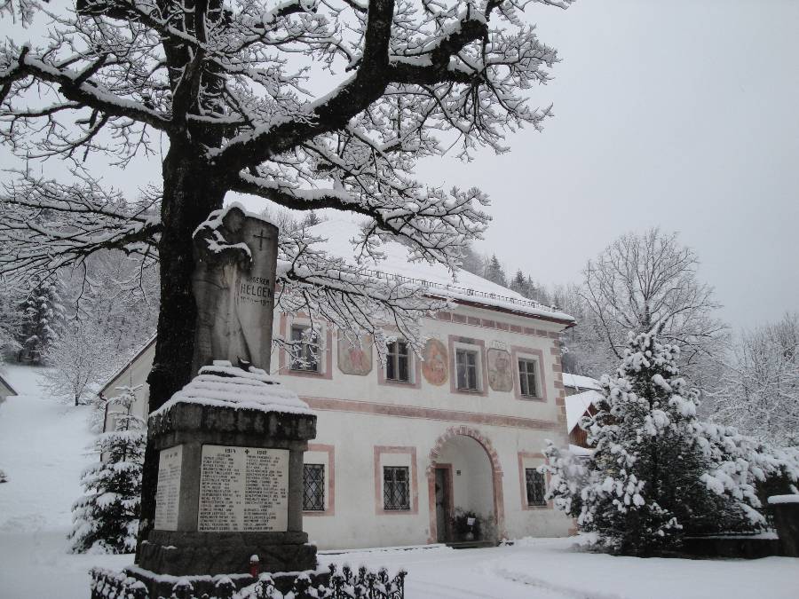 Der Pfarrhof mit dem Kriegerdenkmal, die Kirche, ein leerstehendes Haus mit eigenem Wasserkraftwerk.