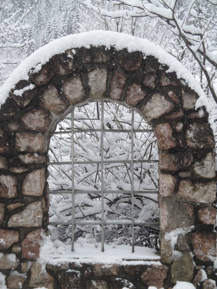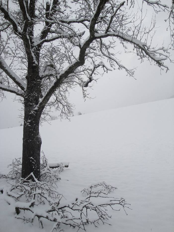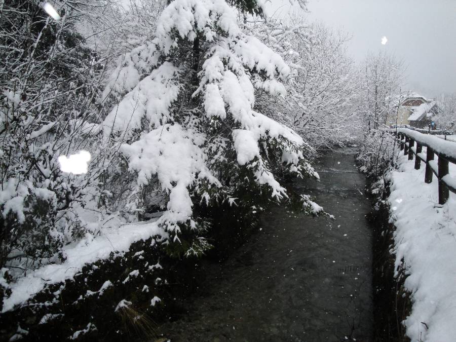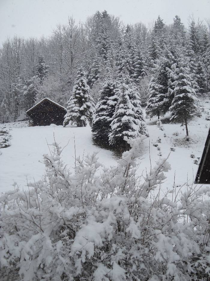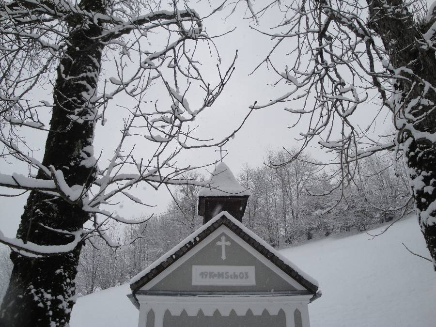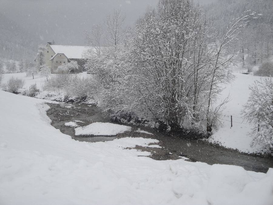 Dem Ortsbach entlang zur Kapelle und das letzte Foto ist gegenüber von unserem Haus und die weissen Flecken sind die dicken Schneeflocken.