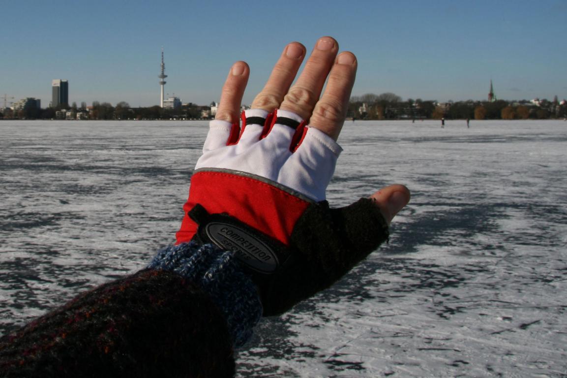 Auf dem Kopf die Mütze, an den Unterarmen Armstulpen, an den Händen meine Halbhandschuhe damit ich noch fotografieren kann
