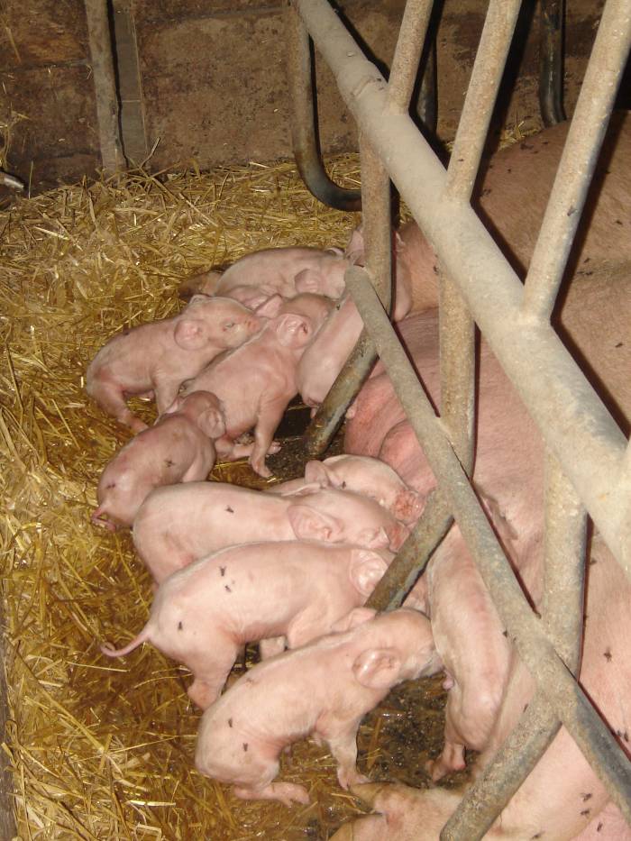 Es ist ein Schwein in einem Stall