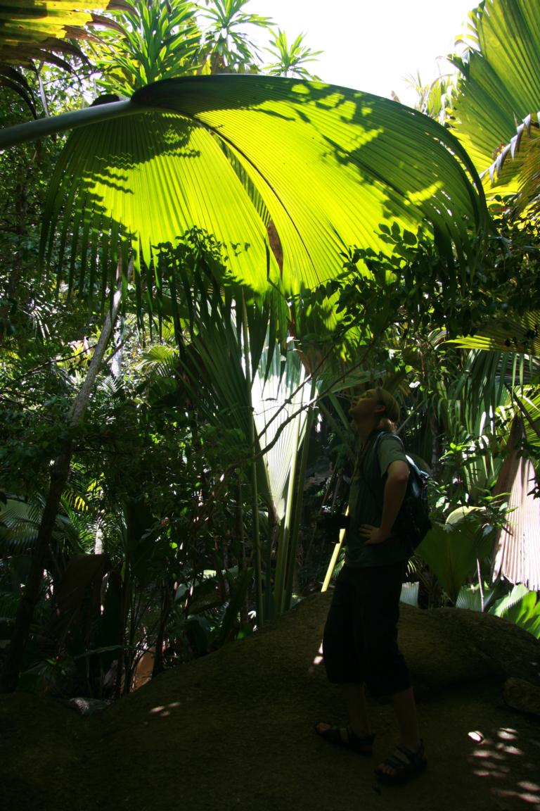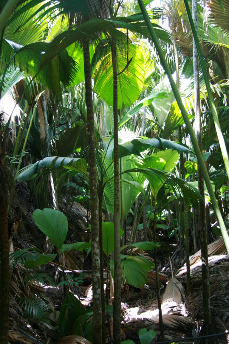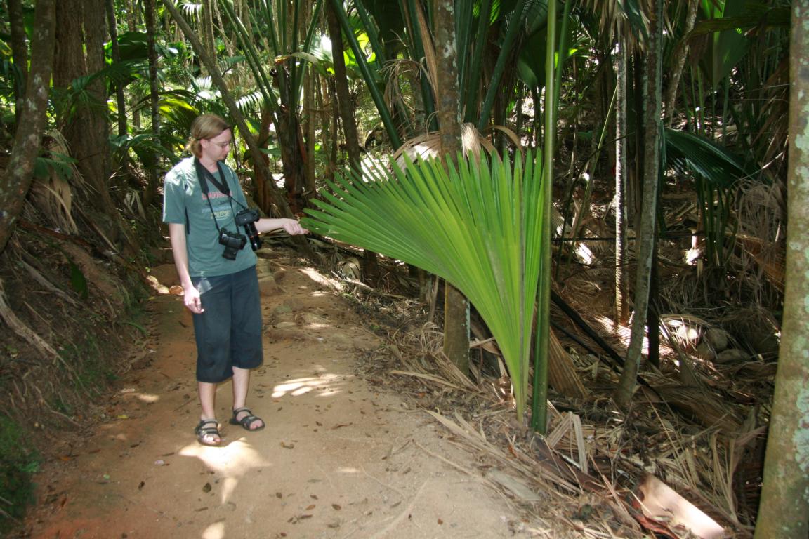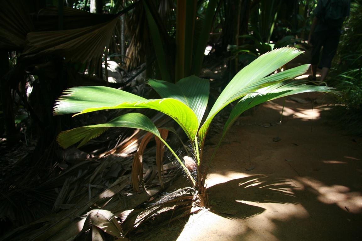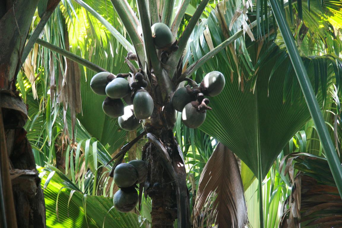 Die Coco de Mar, eine Kokosnussart mit bis zum 25 kg schweren Kokosnüssen. Es gibt männliche und weibliche Pflanzen. Die männlichen Samenträger sehen aus wie ein riesiger Phallus. Die Blätter sind riesig. 15 Jahre dauert es, bis die Jungpflanze einen Stamm ausbildet. Die Meereskokosnuss ist nur hier und auf einer anderen Seychelleninsel heimisch und etwas sehr besonderes.