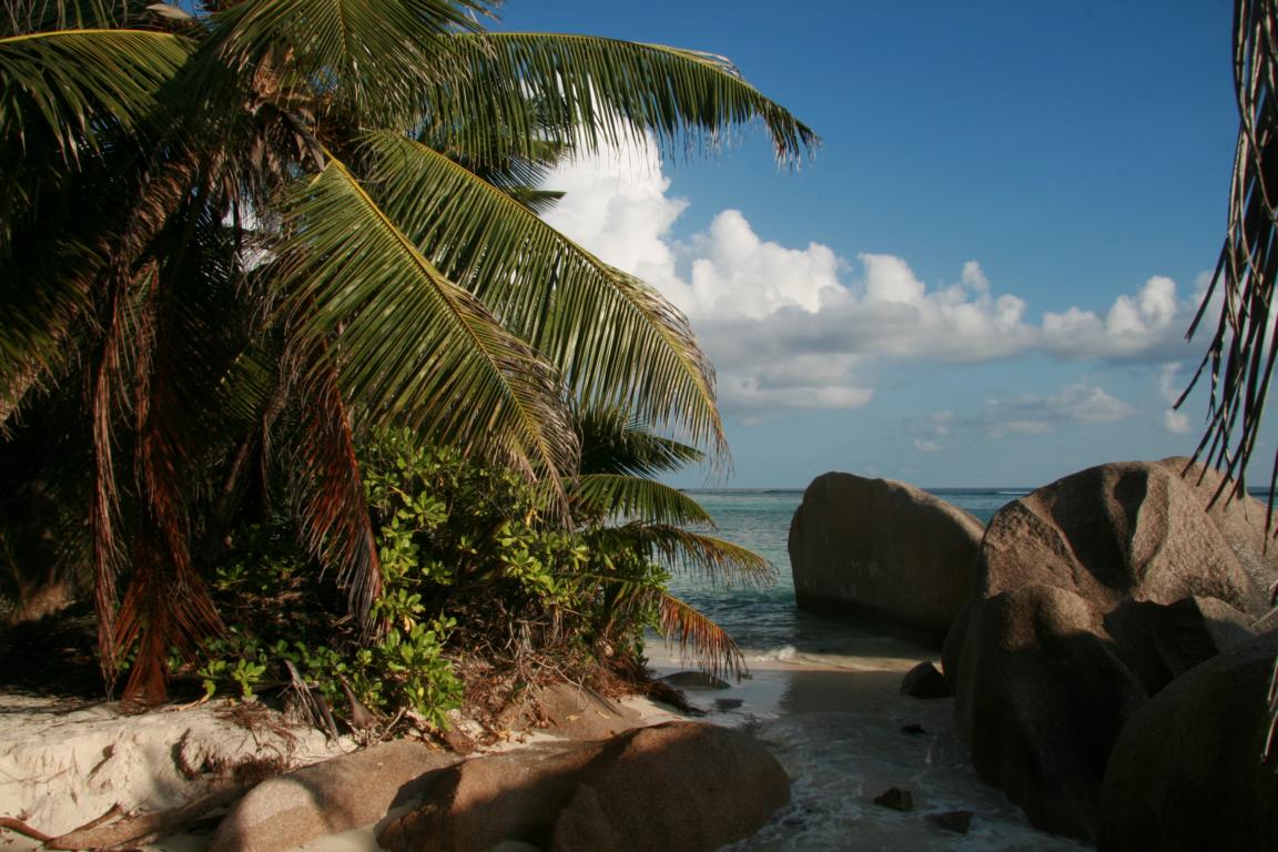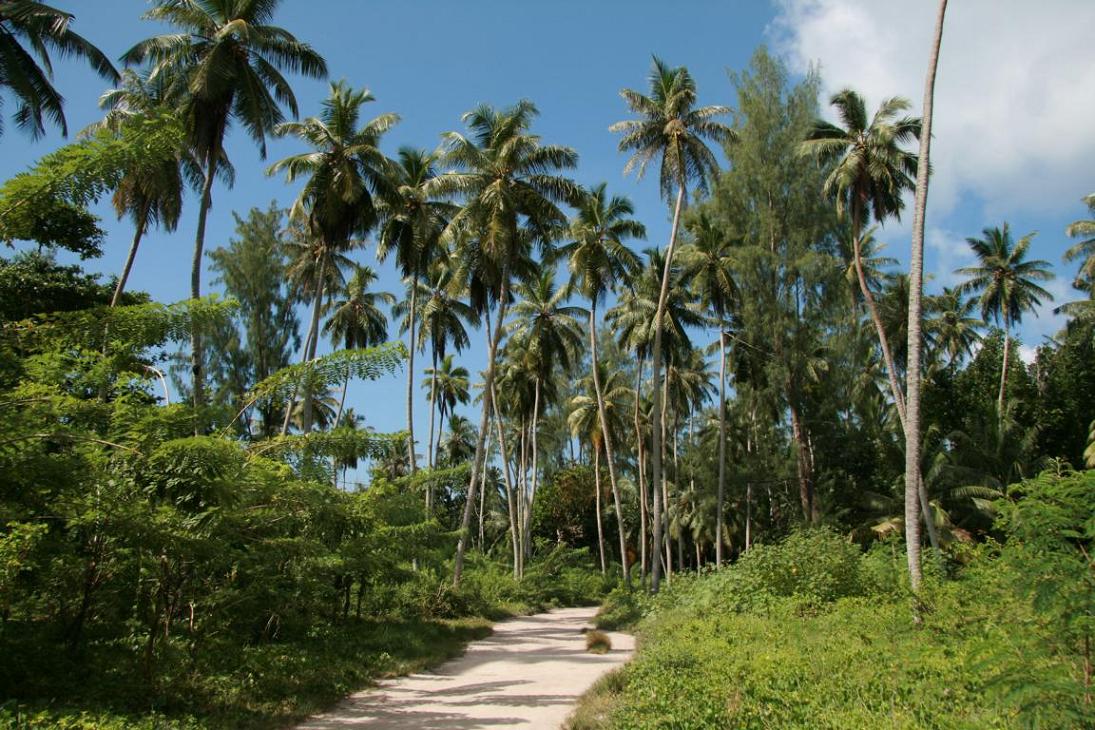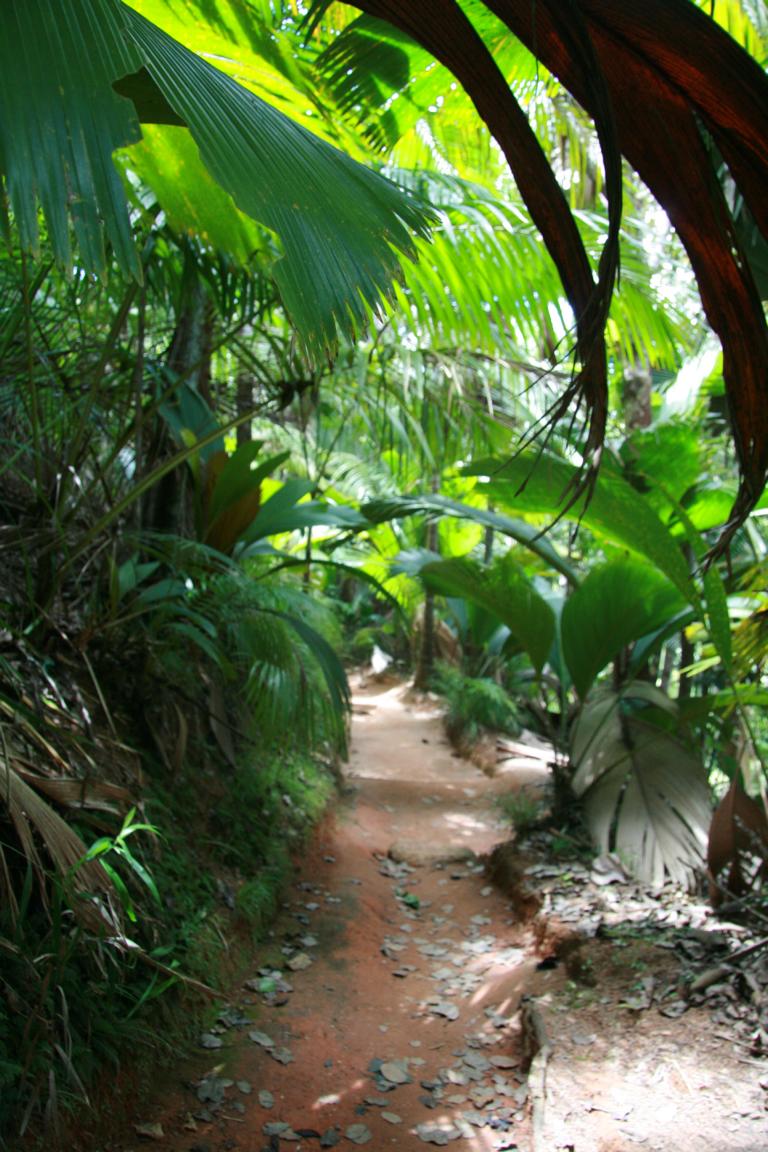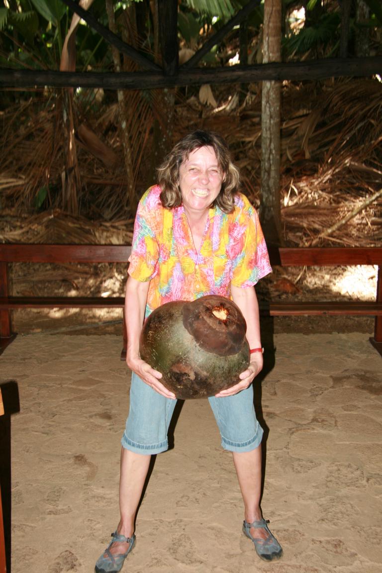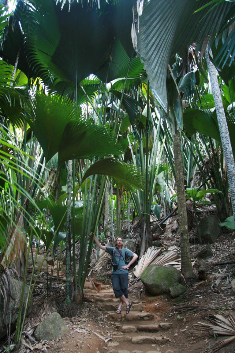 Die Coco de Mar, eine Kokosnussart mit bis zum 25 kg schweren Kokosnüssen. Es gibt männliche und weibliche Pflanzen. Die männlichen Samenträger sehen aus wie ein riesiger Phallus. Die Blätter sind riesig. 15 Jahre dauert es, bis die Jungpflanze einen Stamm ausbildet. Die Meereskokosnuss ist nur hier und auf einer anderen Seychelleninsel heimisch und etwas sehr besonderes.
