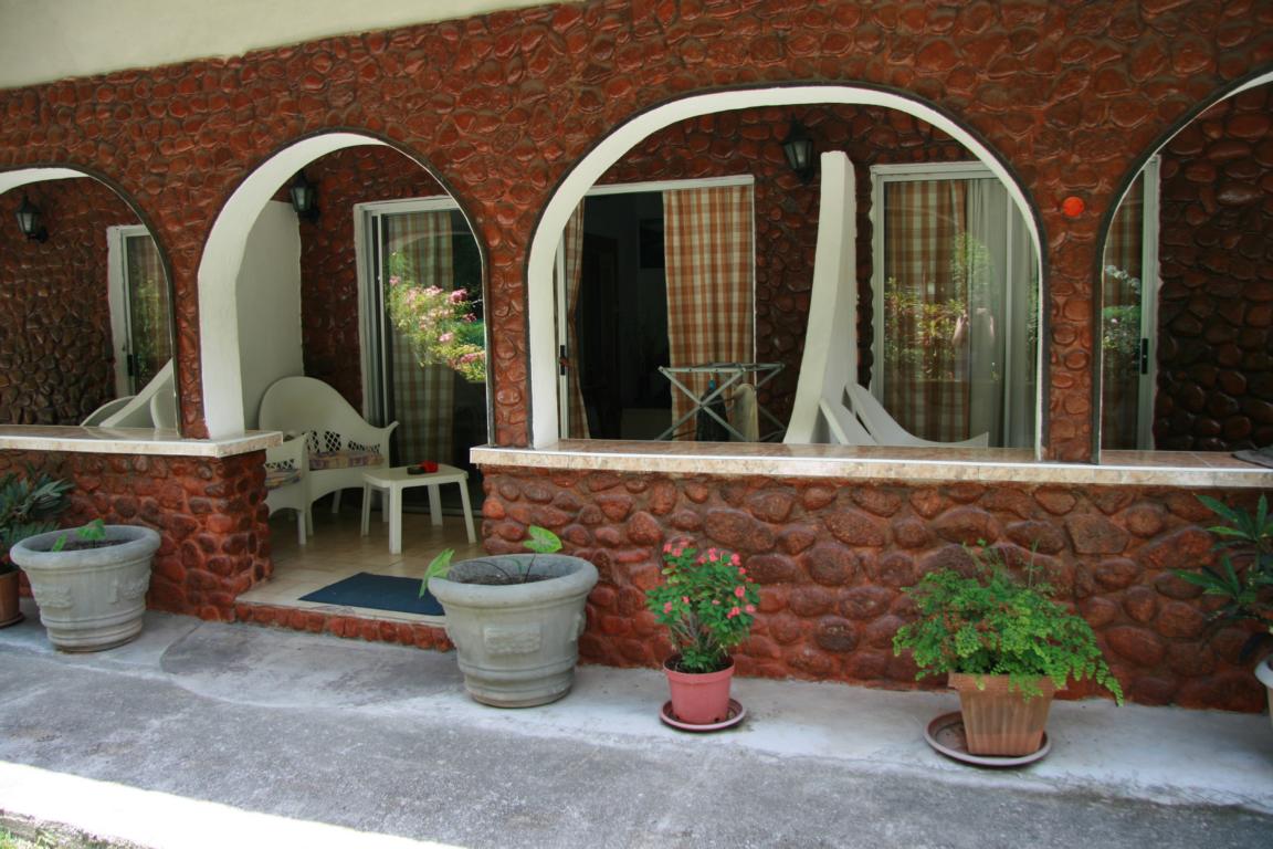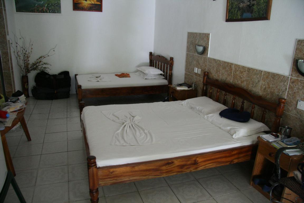Am Pier sprechen wir diesmal gleich die Frau von Creol an, die offensichtlich auch für uns zuständig sind, und die organisiert dann für uns und die Mitreisenden den Fahrer, der erneut die falsche Info hat, wir seien nur 2 und nicht drei Personen. Diesmal gibt es keinen Notsitz, aber Not macht erfinderisch. Ich muss mich halb zwischen die Vordersitze klemmen und dann gehen tatsächlich 4 auf die Rückbank. Die Fahrt ist auch nur kurz. Die anderen sind in der Pension Michel, wir im Rising Sun. Unser Zimmer wird noch fertig gemacht. Es ist ok, hat zwei Doppelbetten – das Bett nicht so groß wie in der letzten Unterkunft und auch nur eine gemeinsame Decke – aber dafür habe ich ja den Jugendherbergsschlafsack mitgebracht, der jetzt zum Einsatz kommt. Es gibt einen Hotelsafe, wo man Sachen herein tun kann. Klimaanlage kostet extra 7 Euro am Tag, wir verzichten. Frühstück gibt es zwischen 8-9, Abendessen – wir haben hier Halbpension – um 19 Uhr.