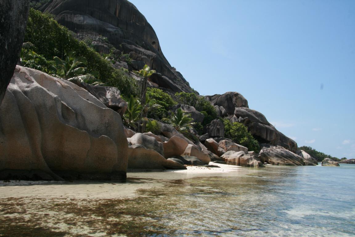 Heute laufen wir ca. 600 m parallel zur Küste zu einem Strand, bei dem man quasi Eintritt - 100 Rupien - pro Person ( 17,5 Rupien waren 1 Euro)bezahlen muss. Wofür, ist eigentlich nicht klar. Das Gebiet heißt LÙnion Estate und wurde zum Nationalerbe erklärt. Auf dem Gelände befindet sich ein altes Farmhaus, ein alter Friedhof, ein Schildkrötengehege und Kopramühlen, in denen Kokosnüsse verarbeitet werden. Doch das interessiert uns zunächst nicht, sondern uns drängt es zum Strand mit dem Namen Source d`Argent – und der ist Seychellen pur. -