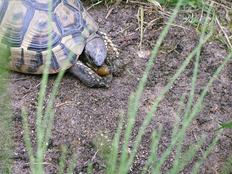 Einstein war im Außenterrarium draußen - das Problem ist ja nur, dass ich da einfach keinen Löwenzahn oder Klee, was er auch liebt, auf Dauer angepflanzt bekomme, weil er jede Neupflanze sofort auffrißt. Also muss jemand was zum Futtern reinschmeißen - das hat meine Nachbarin und dann mein Sohn getan. Momentan ist Einstein ziemlich aggressiv. Sobald man im Gehege ist kommt er angerannt und beißt...Ich muss da unbedingt die Wildness reduzieren, also muss sich da rein. Mache morgen mal Fotos.