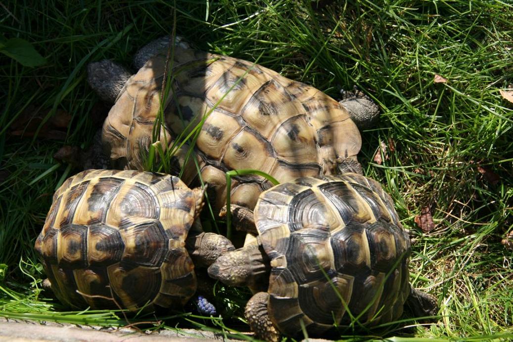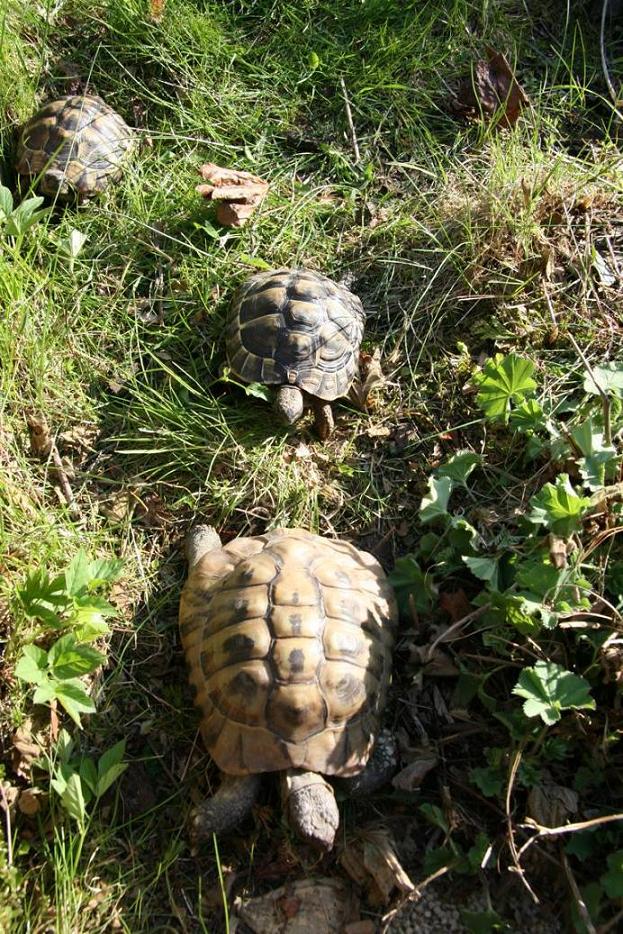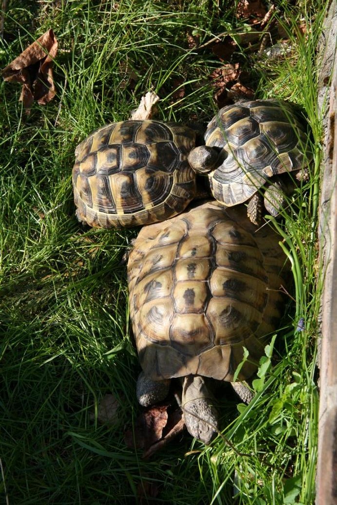 Heute waren die beiden kleinen Schildkröten -Emmi und Ingrid - das erste Mal im Außenterrarium. Nachts ist es noch zu kalt - aber heute Nachmittag war es richtig warm draußen in der Sonne. Und der Große, Einstein, war ebenfalls mit dabei. Ich habe mir kringelig gelacht: Nr 1 peste gleich los nach dem Motto, endlich habe ich mal ein paar Minuten für mich allein. Die2.klebte an dem Großen fest, turnte über ihn rüber, als sei er "ein Stein" - Der war erstaunlich friedlich, und zuckte nur immer wieder zusammen, wenn die Krallen der Kleinen ihn unangenehm trafen. Als sie dann von ihm abließ, rannte er ihr hinterher- denn er reagiert wahnsinnig auf Bewegung. Sobald er eine Bewegung sieht,kommt er angerannt.