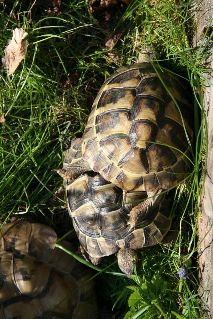 Als die Mauer niedriger war hat er das echt hinbekommen. Gerade an die Wand, Schwanz raus, hochgestemmt und über die Mauer gezogen . Dann raus auf die Straße. Einige Grundstücke weiter ist er dann aufgetaucht-zum Glück in der Familie des Freundes meines Sohnes, die wussten, das wir eine Schildkröte haben und uns dann verständigt hatten... -