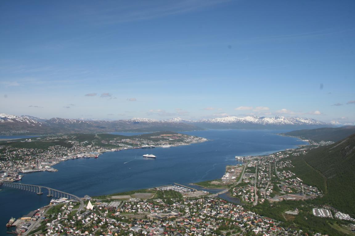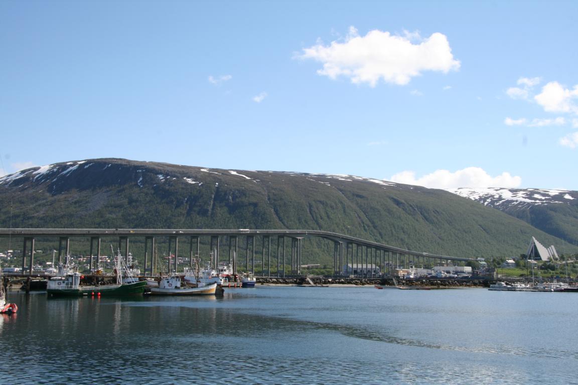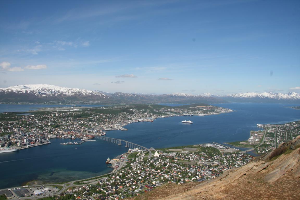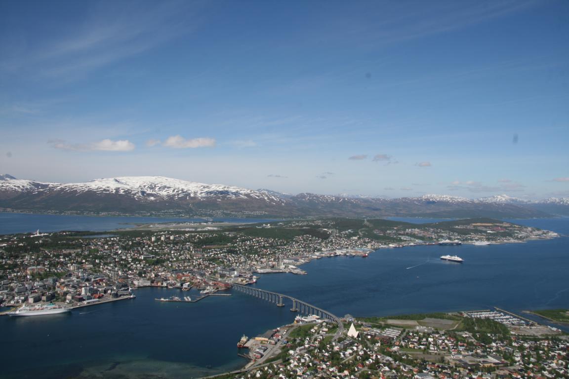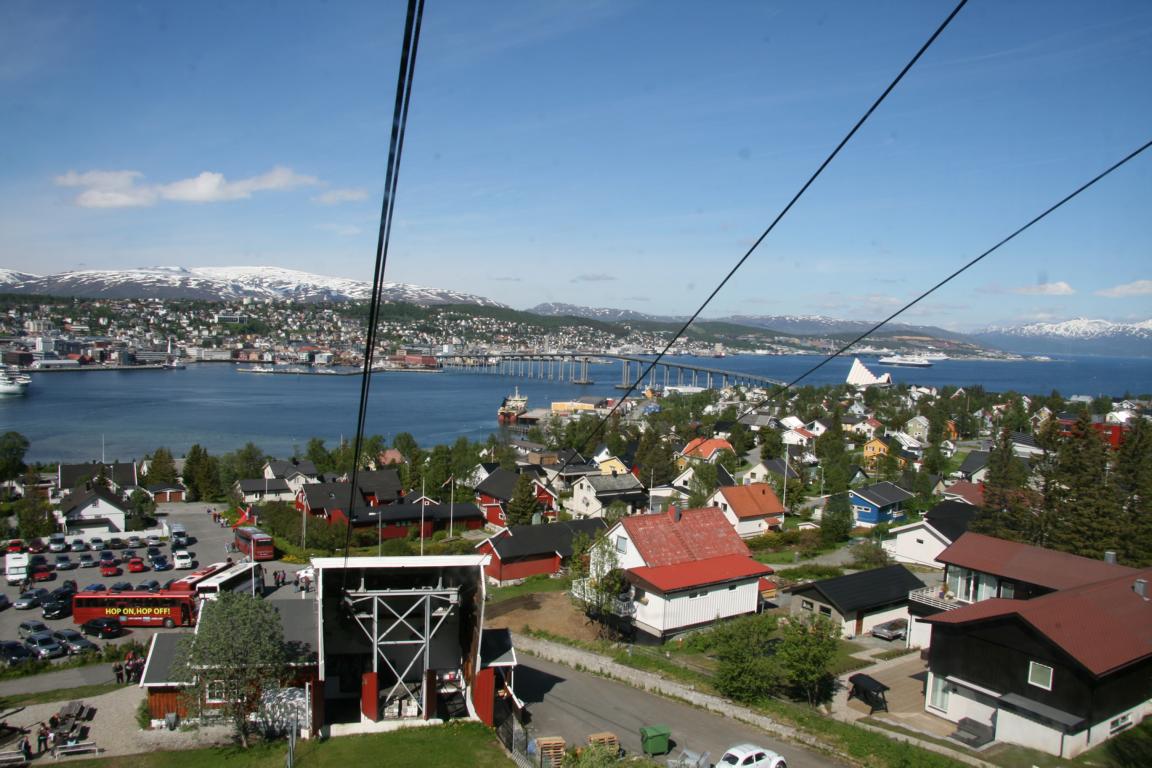 Bei diesem Himmel ist Tromsö noch schöner und deshalb machen wir uns als nächstes auf über die Brücke und zur anderen Seite zu laufen, wo eine Seilbahn hoch auf den Berg fährt