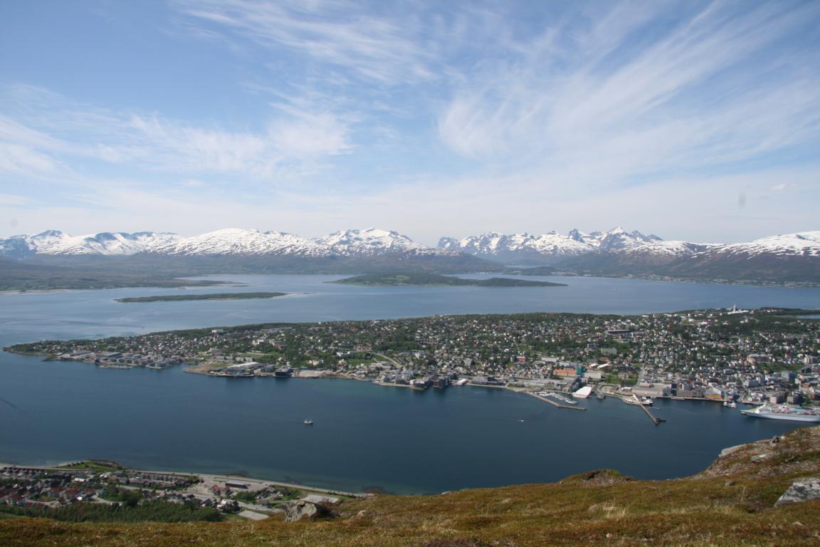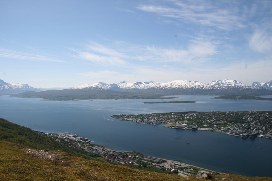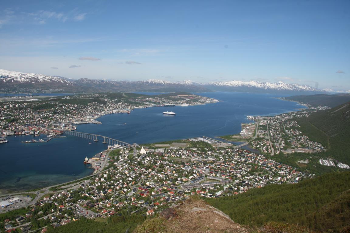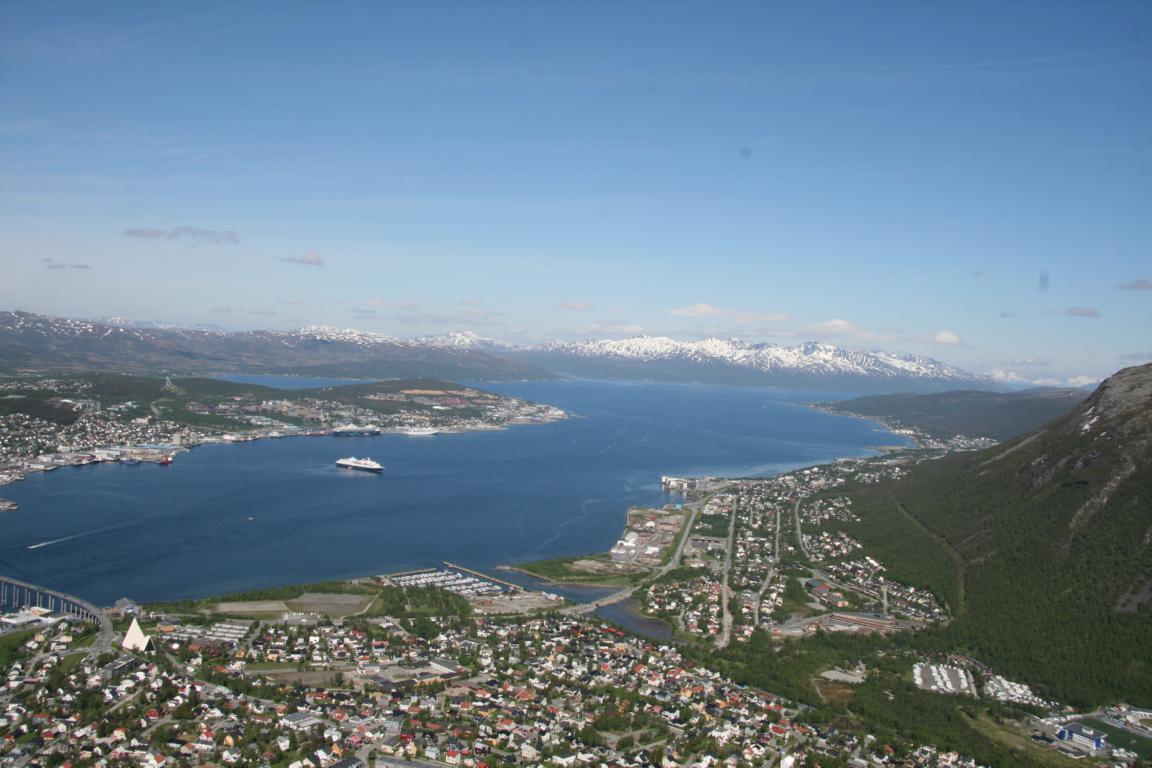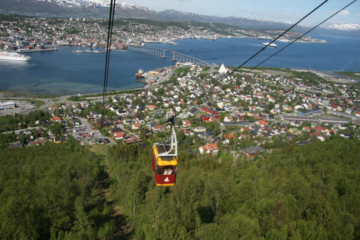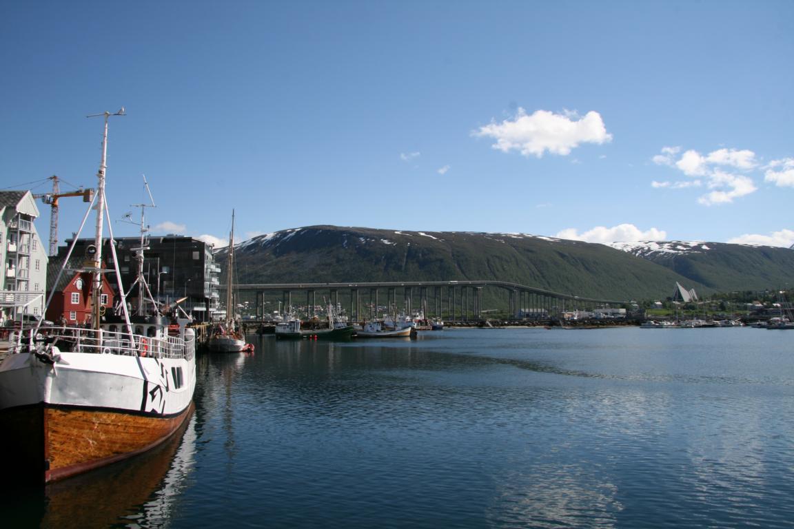 Bei diesem Himmel ist Tromsö noch schöner und deshalb machen wir uns als nächstes auf über die Brücke und zur anderen Seite zu laufen, wo eine Seilbahn hoch auf den Berg fährt