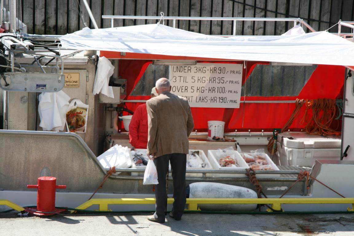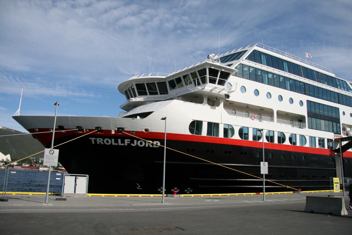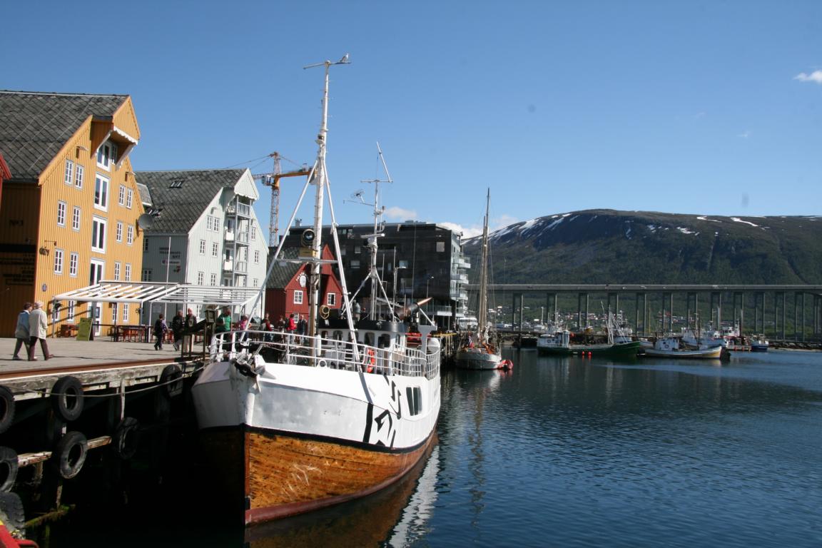 Mir fällt ein, dass heute ja Sonnabend ist und die Geschäfte nicht so lange aufhaben wie gestern. Da war es bis 22-23 Uhr. Heute eher 16-18 Uhr und es ist bereits 16 Uhr. Wir haben beschlossen wieder ein Kilo Garnelen zu kaufen und dazu Salat von der Salatbar. Ich gehe also in den Supermarkt, aber die Salattheke ist bereits ausgeräumt. Also beschließen wir, dass Jan und Okke dort am Hafen sitzen bleiben und was trinken, und ich zum nächsten Supermarkt laufe und dort mein Glück versuche. Das klappt auch. Dann kaufe ich gleich noch Garnelen und bringe den ganzen Kram ins nahe gelegene Hotel, bevor wir nun zusammen Richtung Polaria an der Hafenkante, vorbei am Hurtiglinienschiff laufen.